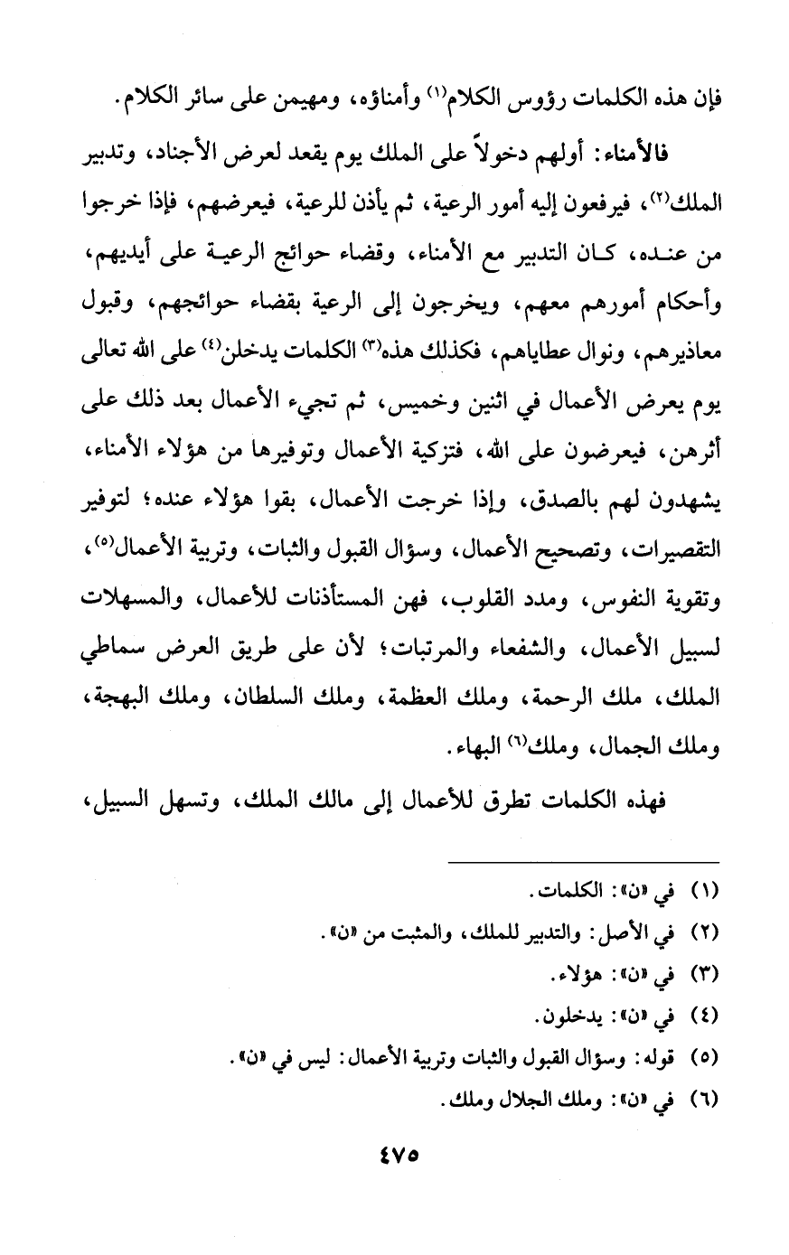فالأمناء: أولهم دخولاً على الملك يوم يقعد لعرض الأجناد، وتدبير الملك، فيرفعون إليه أمور الرعية، ثم يأذن للرعية، فيعرضهم، فإذا خرجوا من عنده، كان التدبير مع الأمناء، وقضاء حوائج الرعية على أيديهم، وأحكام أمورهم معهم، ويخرجون إلى الرعية بقضاء حوائجهم، وقبول معاذيرهم، ونوال عطاياهم، فكذلك هذه الكلمات يدخلن على الله تعالى يوم يعرض الأعمال في اثنين وخميس، ثم تجيء الأعمال بعد ذلك على أثرهن، فيعرضون على الله، فتزكية الأعمال وتوفيرها من هؤلاء الأمناء، يشهدون لهم بالصدق، وإذا خرجت الأعمال، بقوا هؤلاء عنده؛ لتوفير التقصيرات، وتصحيح الأعمال، وسؤال القبول والثبات، وتربية الأعمال، وتقوية النفوس، ومدد القلوب، فهن المستأذنات للأعمال، والمسهلات لسبيل الأعمال، والشفعاء والمرتبات؛ لأن على طريق العرض سماطي الملك، ملك الرحمة، وملك العظمة، وملك السلطان، وملك البهجة، وملك الجمال، وملك البهاء.