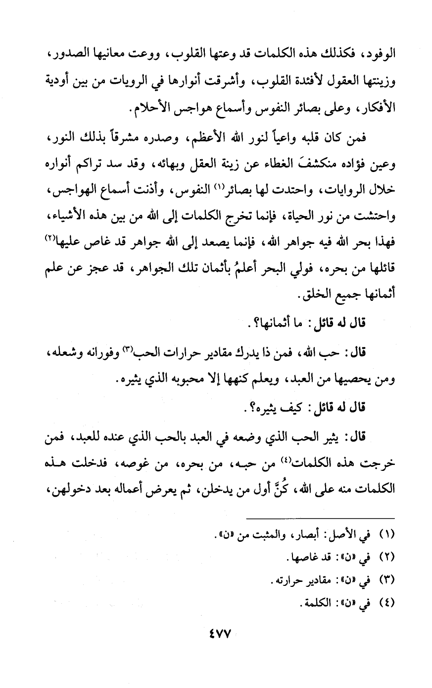 فمن كان قلبه واعياً لنور الله الأعظم، وصدره مشرقاً بذلك النور، وعين فؤاده منكشف الغطاء من زينة العقل وبهائه، وقد سد تراكم أنواره خلال الروايات، واحتدت لها بصائر النفوس، وأذنت أسماع الهواجس، واحتشت من نور الحياة، فإنما تخرج الكلمات إلى الله من بين هذه الأشياء، فهذا بحر الله فيه جواهر الله، فإنما يصعد إلى الله جواهر قد غاص عليها قائلها من بحره، فولي البحر أعلم بأثمان تلك الجواهر، قد عجز عن علم أثمانها جميع الخلق.