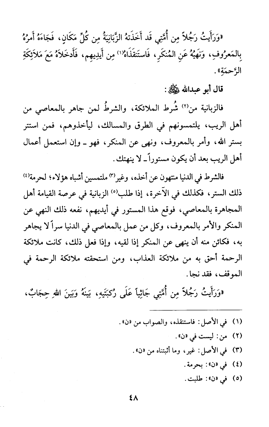 فالشرط في الدنيا منتهون عن أخذه، وغير ملتمسين أشباه هؤلاء؛ لحرمة ذلك الستر، فكذلك في الآخرة، إذا طلب الزبانية في عرصة القيامة أهل المجاهرة بالمعاصي، فوقع هذا المستور في أيديهم، نفعه ذلك النهي عن المنكر والأمر بالمعروف، وكل من عمل بالمعاصي في الدنيا سراً لا يجاهر به، فكائن منه أن ينهى عن المنكر إذا لقيه، وإذا فعل ذلك، كانت ملائكة الرحمة أحق به من ملائكة العذاب، ومن استحقته ملائكة الرحمة في الموقف، فقد نجا.