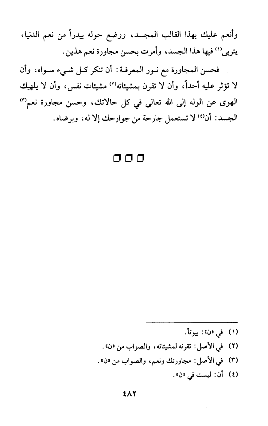 فحسن المجاورة مع نور المعرفة: أن تنكر كل شيء سواه، وأن لا تؤثر عليه أحداً، وأن لا تقرن بمشيئاته مشيئات نفس، وأن لا يلهيك الهوى عن الوله إلى الله تعالى في كل حالاتك، وحسن مجاورة نعم الجسد: أن لا تستعمل جارحة من جوارحك إلا له، وبرضاه.