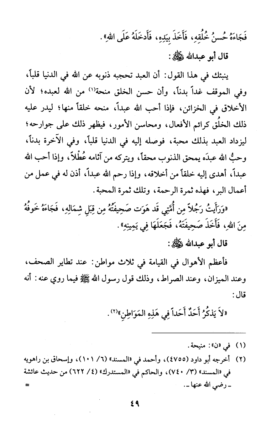 ينبئك في هذا القول: أن العبد تحجبه ذنوبه عن الله في الدنيا قلباً، وفي الموقف غداً بدناً، وأنا حسن الخلق منحة من الله لعبده؛ لأن الأخلاق في الخزائن، فإذا أحب الله عبداً، منحه خلقاً منها؛ ليدر عليه ذلك الخلق كرائم الأفعال، ومحاسن الأمور، فيظهر ذلك على جوارحه؛ ليزداد العبد بذلك محبة، فوصله إليه في الدنيا قلباً، وفي الآخرة بدناً، وحب الله عبده يمحق الذنوب محقاً، ويتركه من آثامه عطلاً، وإذا أحب الله عبداً، أهدى إليه خلقاً من أخلاقه، وإذا رحم الله عبداً، أذن له في عمل من أعمال البر، فهذه ثمرة الرحمة، وتلك ثمرة المحبة.