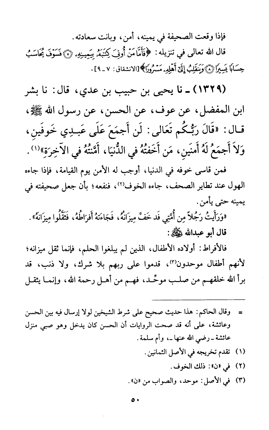 1329 - نا يحيى بن حبيب بن عدي، قال: نا بشر ابن المفضل، عن عوف، عن الحسن، عن رسول الله صلى الله عليه وسلم، قال: ((قال ربكم تعالى: لن أجمع على عبدي خوفين، ولا أجمع له أمنين، من أخفته في الدنيا، أمنته في الآخرة)).
