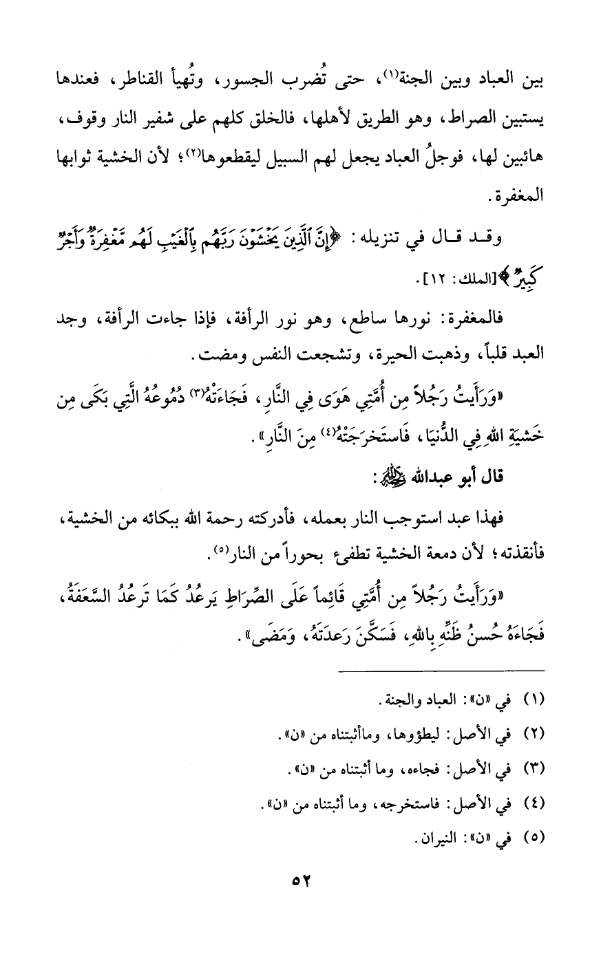 بين العباد وبين الجنة، حتى تضرب الجسور، وتهيأ القناطر، فعندها يستبين الصراط، وهو الطريق لأهلها، فالخلق كلهم على شفير النار وقوف، هائبين لها، فوجل العباد يجعل لهم السبيل ليقطعوها؛ لأن الخشية ثوابها المغفرة.