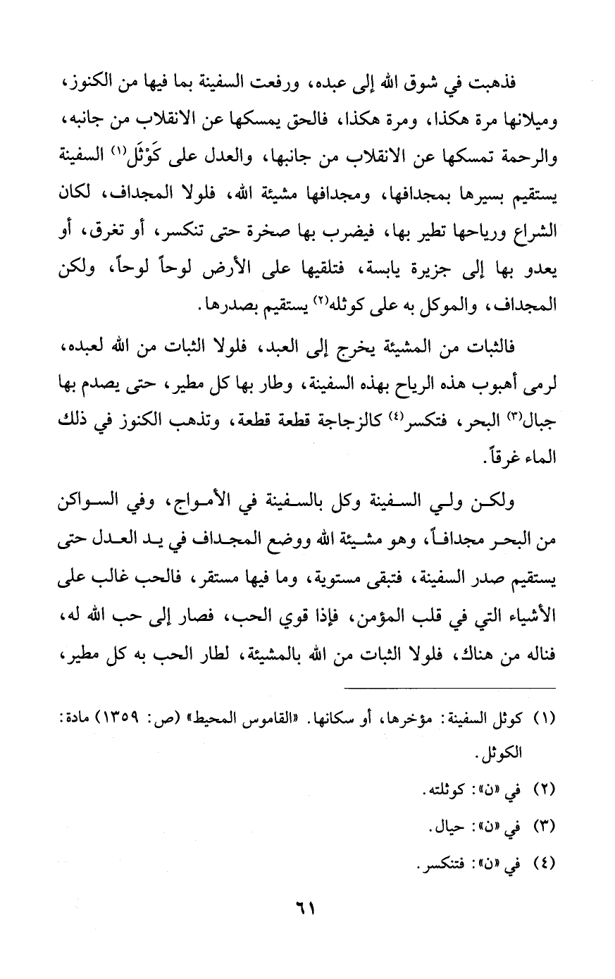 فذهبت في شوق الله إلى عبده، ورفعت السفينة بما فيها من الكنوز، وميلانها مرة هكذا، ومرة هكذا، فالحق يمسكها عن الانقلاب من جانبه، والرحمة تمسكها عن الانقلاب من جانبها، والعدل على كوثل السفينة يستقيم بسيرها بمجدافها، ومجدافها مشيئة الله، فلولا المجداف، لكان الشراع ورياحها تطير بها، فيضرب بها صخرة حتى تنكسر، أو تغرق، أو يعدو بها إلى جزيرة يابسة، فتلقيها على الأرض لوحاً لوحاً، ولكن المجداف، والموكل به على كوثله يستقيم بصدرها.