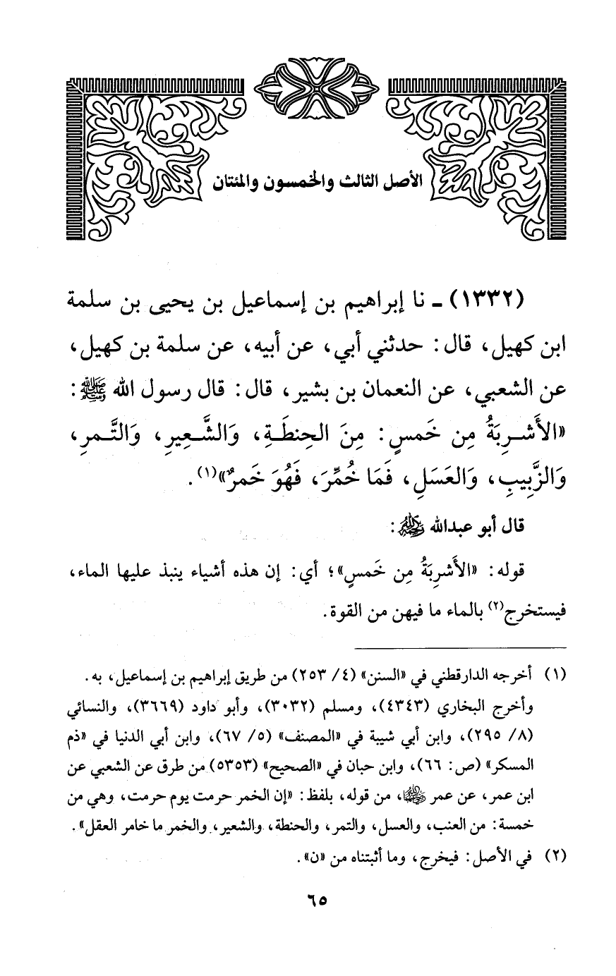 1332 - نا إبراهيم بن إسماعيل بن يحيى بن سلمة ابن كهيل، قال: حدثني أبي، عن أبيه، عن سلمة بن كهيل، عن الشعبي، عن النعمان بن بشير، قال: قال رسول الله صلى الله عليه وسلم: ((الأشربة من خمسٍ: من الحنطة، والشعير، والتمر، والزبيب، والعسل، فما خمر، فهو خمرٌ)).