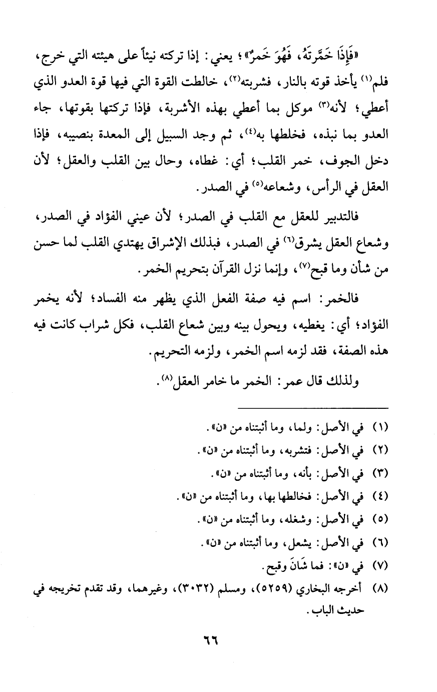 ((فإذا خمرته، فهو خمرٌ))! يعني: إذا تركته نيئاً على هيئته التي خرج، فلم يأخذ قوته بالنار، فشربته، خالطت القوة التي فيها قوة العدو الذي أعطي؛ لأنه موكل بما أعطي بهذه الأشربة، فإذا تركتها بقوتها، جاء العدو بما نبذه، فخلطها به، ثم وجد السبيل إلى المعدة بنصيبه، فإذا دخل الجوف، خمر القلب؛ أي: غطاه، وحال بين القلب والعقل؛ لأن العقل في الرأس، وشعاعه في الصدر.