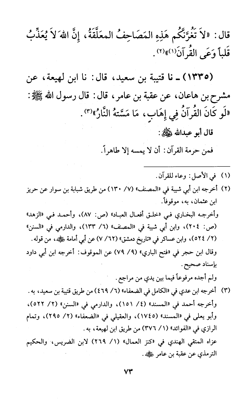 1335 - نا قتيبة بن سعيد، قال: نا ابن لهيعة، عن مشرح بن هاعان، عن عقبة بن عامر، قال: قال رسول الله صلى الله عليه وسلم: ((لو كان القرآن في إهابٍ، ما مسته النار)).