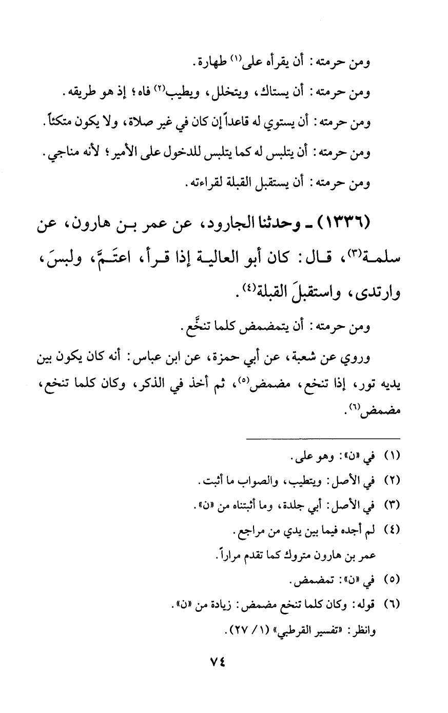 1336 - وحدثنا الجارود، عن عمر بن هارون، عن سلمة، قال: كان أبو العالية إذا قرأ، اعتم، ولبس، وارتدى، واستقبل القبلة.