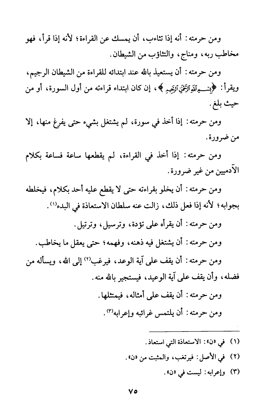 ومن حرمته: أن يخلو بقراءته حتى لا يقطع عليه أحد بكلام، فيخلطه بجوابه؛ لأنه إذا فعل ذلك، زالت عنه سلطان الاستعاذة في البدء.