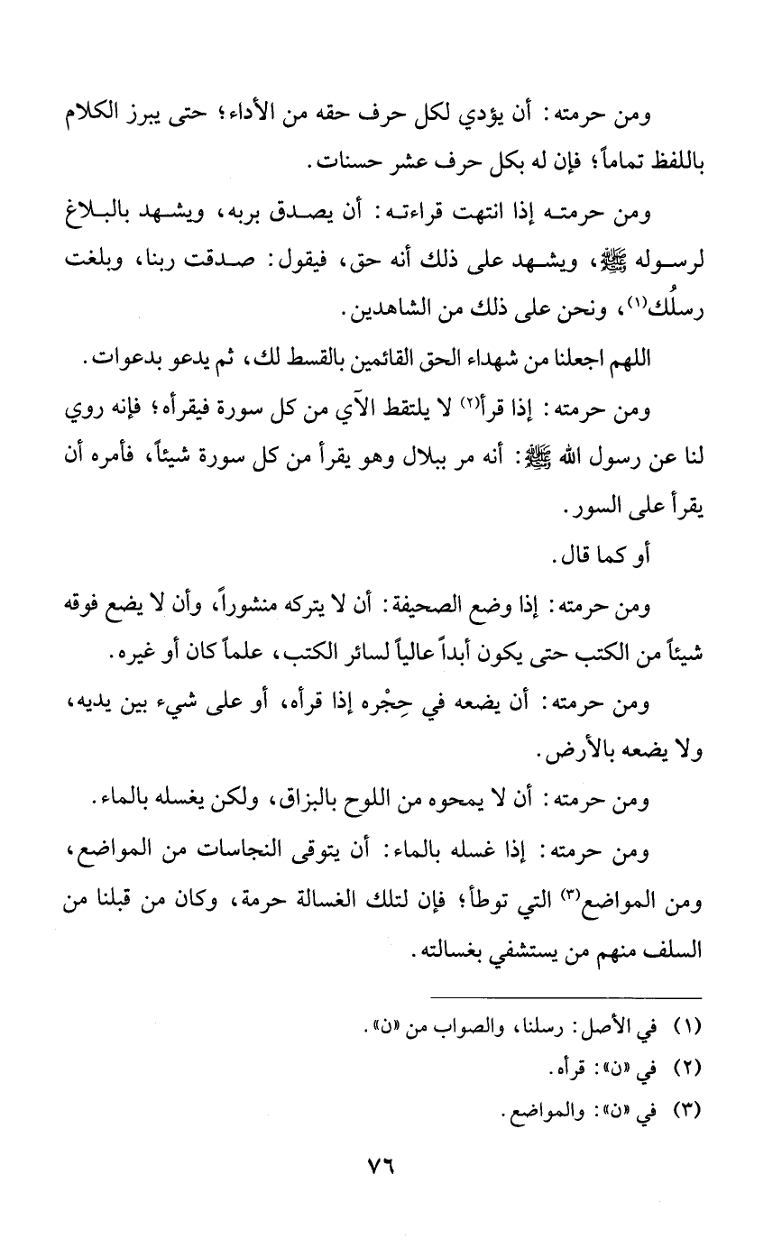 ومن حرمته: أن يؤدي لكل حرف حقه من الأداء؛ حتى يبرز الكلام باللفظ تماماً؛ فإن له بكل حرف عشر حسنات.