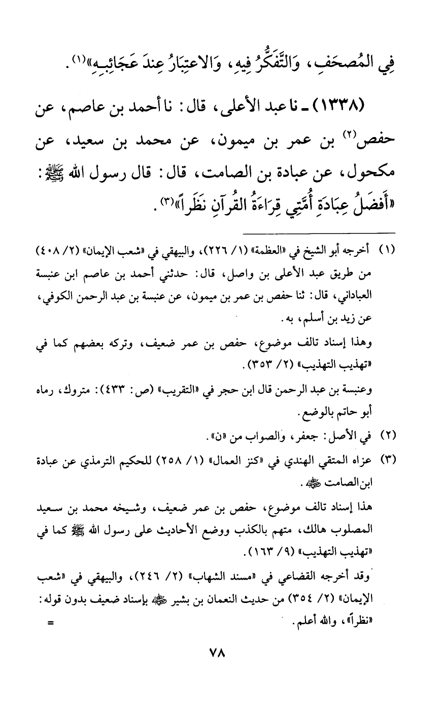 1338 - نا عبد الأعلى، قال: نا أحمد بن عاصم، عن حفص بن عمر بن ميمون، عن محمد بن سعيد، عن مكحول، عن عبادة بن الصامت، قال: قال رسول الله صلى الله عليه وسلم: ((أفضل عبادة أمتي قراءة القرآن نظراً)).