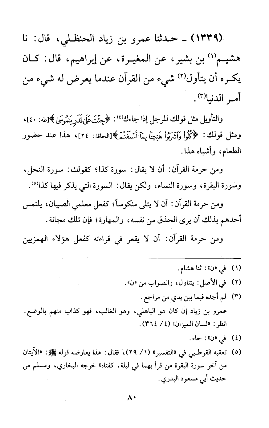 1339 - حدثنا عمرو بن زياد الحنظلي، قال: نا هشيم بن بشير، عن المغيرة، عن إبراهيم، قال: كان يكره أن يتأول شيء من القرآن عندما يعرض له شيء من أمر الدنيا.
