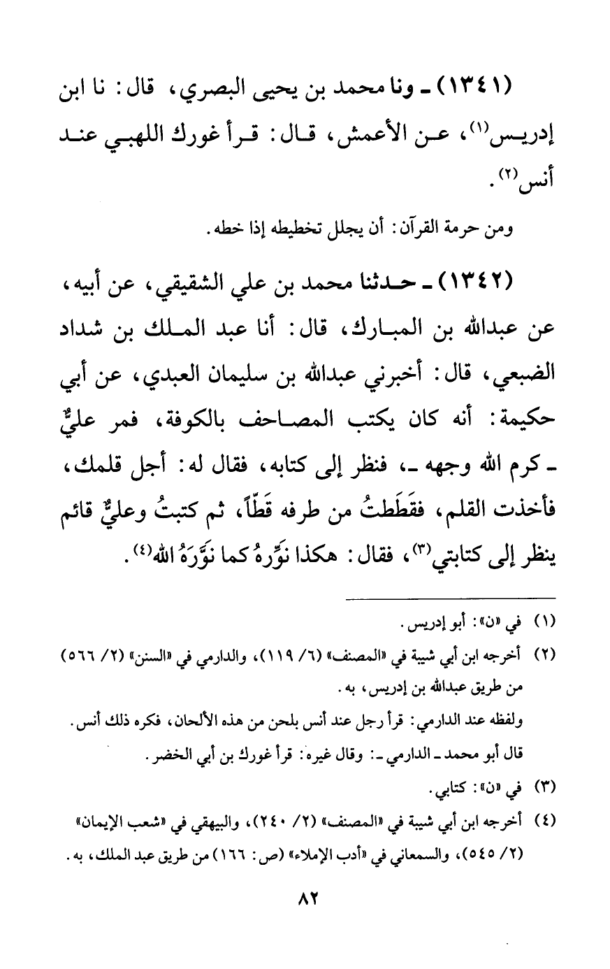 1342 - حدثنا محمد بن علي الشقيقي، عن أبيه، عن عبد الله بن المبارك، قال: أنا عبد الملك بن شداد الضبعي، قال: أخبرني عبد الله بن سليمان العبدي، عن أبي حكيمة: أنه كان يكتب المصاحف بالكوفة، فمر عليٌّ -كرم الله وجهه-، فنظر إلى كتابه، فقال له: أجل قلمك، فأخذت القلم، فقططت من طرفه قطاً، ثم كتبت وعليٌّ قائم ينظر إلى كتابتي، فقال: هكذا نوره كما نوره الله.