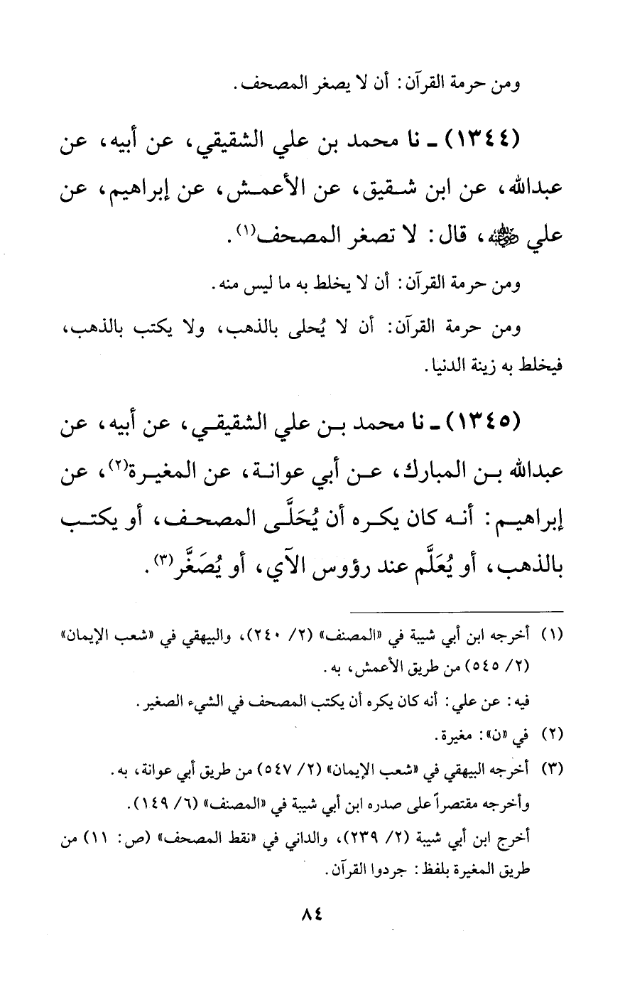 1344 - نا محمد بن علي الشقيقي، عن أبيه، عن عبد الله، عن ابن شقيق، عن الأعمش، عن إبراهيم، عن علي رضي الله عنه، قال: لا تصغر المصحف.