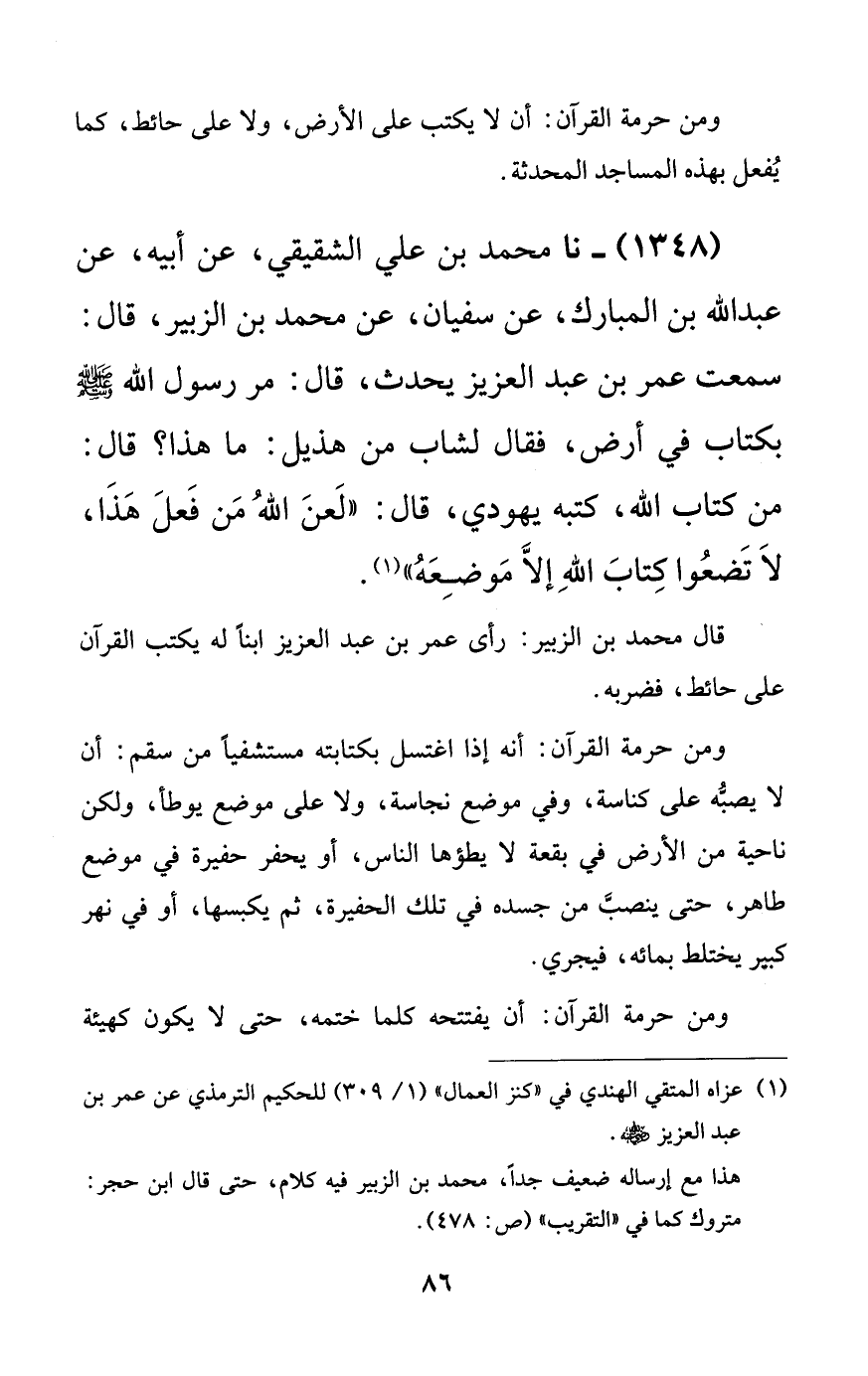 1348 - نا محمد بن علي الشقيقي، عن أبيه، عن عبد الله بن المبارك، عن سفيان، عن محمد بن الزبير، قال: سمعت عمر بن عبد العزيز يحدث، قال: مر رسول الله صلى الله عليه وسلم بكتاب في أرض، فقال لشاب من هذيل: ما هذا؟ قال: من كتاب الله، كتبه يهودي، قال: ((لعن الله من فعل هذا، لا تضعوا كتاب الله إلا موضعه)).