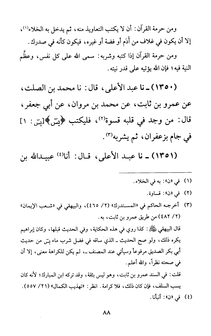 1350 - نا عبد الأعلى، قال: نا محمد بن الصلت، عن عمرو بن ثابت، عن محمد بن مروان، عن أبي جعفر، قال: من وجد في قلبه قسوة، فليكتب {يس} في جام بزعفران، ثم يشربه.