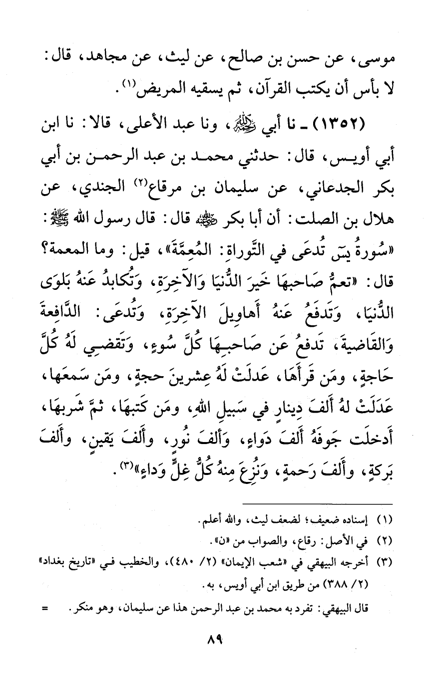 1352 - نا أبي رحمه الله، ونا عبد الأعلى، قالا: نا ابن أبي أويس، قال: حدثني محمد بن عبد الرحمن بن أبي بكر الجدعاني، عن سليمان بن مرقاع الجندي، عن هلال بن الصلت: أن أبا بكر رضي الله عنه قال: قال رسول الله صلى الله عليه وسلم: ((سورة يس تدعى في التوراة: المعمة))، قيل: وما المعمة؟ قال: ((تعم صاحبها خير الدنيا والآخرة، وتكابد عنه بلوى الدنيا، وتدفع عنه أهاويل الآخرة، وتدعى: الدافعة والقاضية، تدفع عن صاحبها كل سوءٍ، وتقضي له كل حاجةٍ، ومن قرأها، عدلت له عشرين حجةٍ، ومن سمعها، عدلت له ألف دينارٍ في سبيل الله، ومن كتبها، ثم شربها، أدخلت جوفه ألف دواءٍ، وألف نورٍ، وألف يقينٍ، وألف بركةٍ، وألف رحمةٍ، ونزع منه كل غلٍّ وداءٍ)).