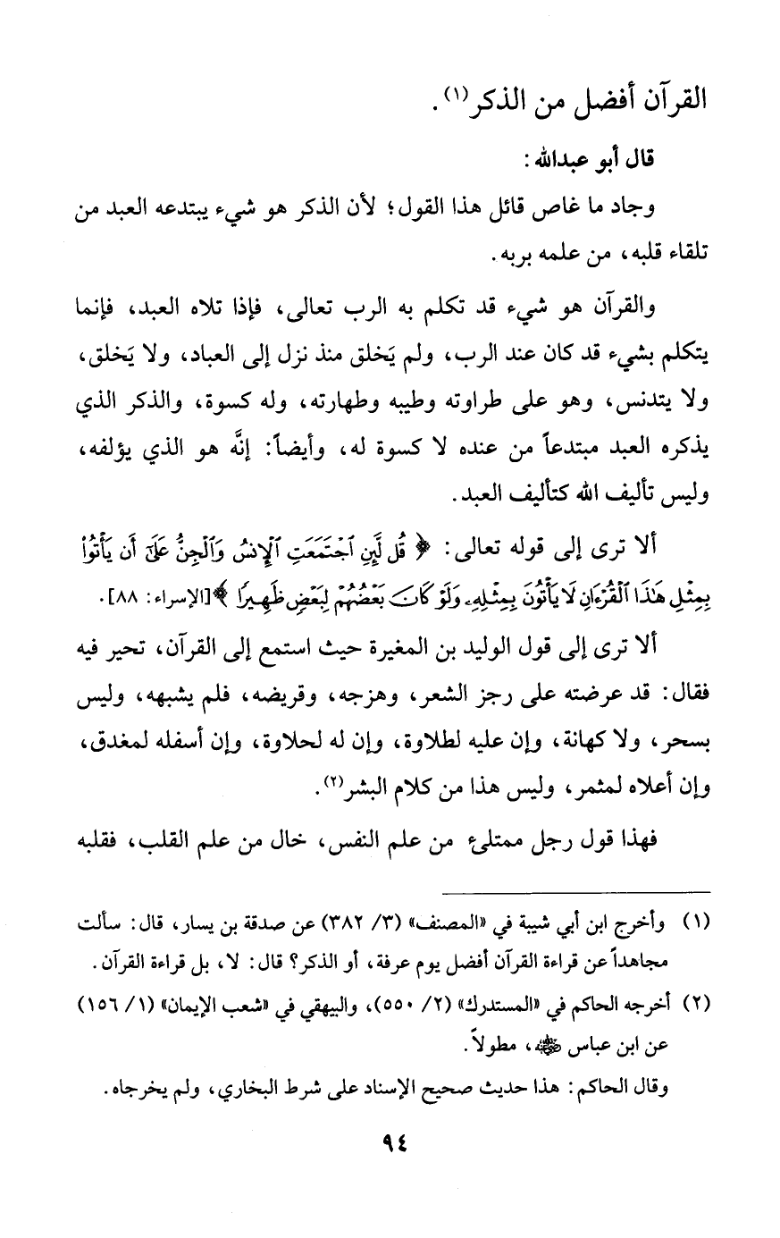 والقرآن هو شيء قد تكلم به الرب تعالى، فإذا تلاه العبد، فإنما يتكلم بشيء قد كان عند الرب، ولم يخلق منذ نزل إلى العباد، ولا يخلق، ولا يتدنس، وهو على طراوته وطيبه وطهارته، وله كسوة، والذكر الذي يذكره العبد مبتدعاً من عنده لا كسوة له، وأيضاً: إنه هو الذي يؤلفه، وليس تأليف الله كتأليف العبد.