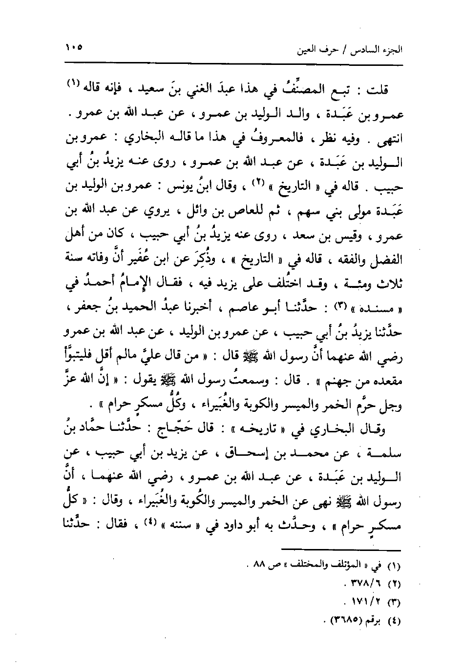 قلت: تبع المُصَنّف فِي هَذَا عبد الْغَنِيّ بن سعيد، فَإِنَّهُ قَالَه عَمْرو بن عَبدة، وَالِد الْوَلِيد بن عَمْرو، عَن عبد الله بن عَمْرو. انْتهى. وَفِيه نظر، فالمعروف فِي هَذَا مَا قَالَه البُخَارِيّ: عَمْرو بن الْوَلِيد بن عَبدة، عَن عبد الله بن عَمْرو، روى عَنهُ يزِيد بن أبي عَبدة مولى بني سهم، ثمَّ للعاص بن وَائِل، يروي عَن عبد الله بن عَمْرو، وَقيس بن سعد، روى عَنهُ يزِيد بن أبي حبيب قَالَه فِي " التَّارِيخ "، وَقَالَ ابْن يُونُس: عَمْرو بن الْوَلِيد بن عَبَدة مولى بني سهم، ثمَّ للعاص بن وَائِل، يروي عَن عبد الله بن عَمْرو، وَقيس بن سعد، روى عَنهُ يزِيد بن أبي حبيب، كَانَ من أهل الْفضل وَالْفِقْه، قَالَه فِي " التَّارِيخ "، وَذكر عَن ابْن عفير أَن وَفَاته سنة ثَلَاث ومئة، وَقد اخْتلف على يزِيد فِيهِ، فَقَالَ الإِمَام أَحْمد فِي " مُسْنده ": حَدثنَا أَبُو عَاصِم، أخبرنَا عبد الحميد بن جَعْفَر، حَدثنَا يزِيد بن أبي حبيب، عَن عَمْرو بن الْوَلِيد، عَن عبد الله بن عَمْرو رَضِي الله عَنْهُمَا أَن رَسُول الله صلى الله عَلَيْهِ وَسلم قَالَ: " من قَالَ عَليّ مَا لم أقل فَليَتَبَوَّأ مَقْعَده من جَهَنَّم ". قَالَ: وَسمعت رَسُول الله صلى الله عَلَيْهِ وَسلم يَقُول: " إِن الله عز وَجل حرم الْخمر وَالْميسر والكوبة والغبيراء، وكل مُسكر حرَام ".