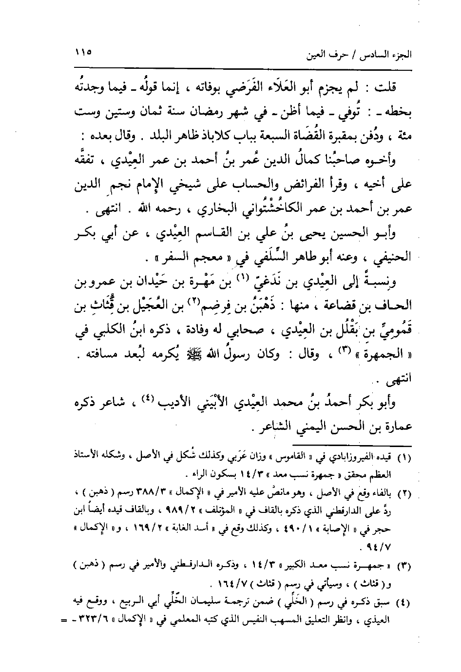 وَنسبَة إِلَى العيدي بن ندغي بن مهرَة بن حيدان بن عَمْرو بن الحاف بن قضاعة، مِنْهَا: ذهبن بن فرضم بن العجيل بن قثاث بن قمومي بن بقلل بن العيدي، صَحَابِيّ لَهُ وفادة، ذكره ابْن الْكَلْبِيّ فِي " الجمهرة "، وَقَالَ: وَكَانَ رَسُول الله صلى الله عَلَيْهِ وَسلم يُكرمهُ لبعد مسافته. انْتهى.