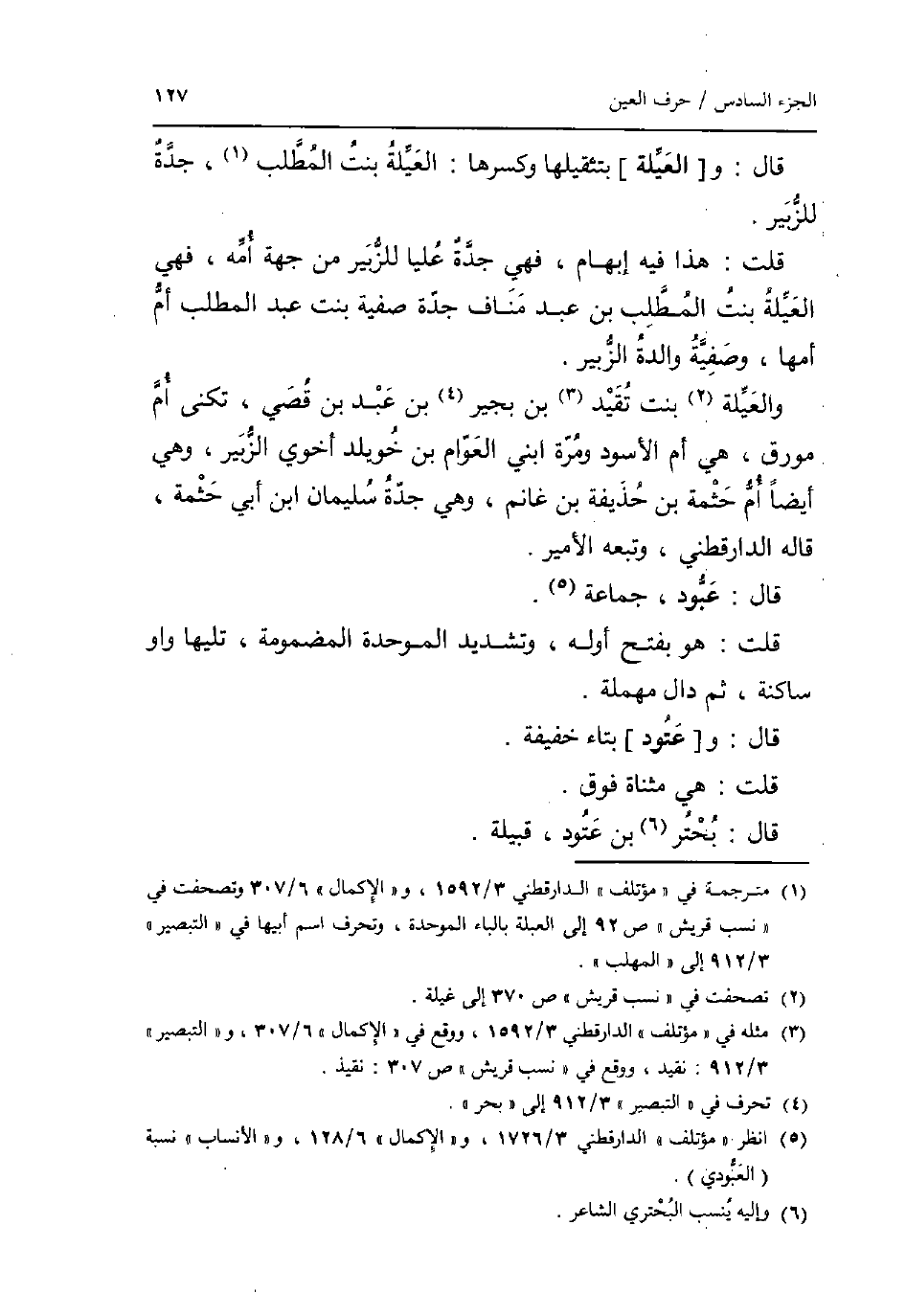 قلت: هَذَا فِيهِ إِبْهَام، فَهِيَ جدة عليا للزبير من جِهَة أمه، فَهِيَ الْعيلَة بنت الْمطلب بن عبد منَاف جدة صَفِيَّة بنت عبد الْمطلب أم أمهَا، وَصفِيَّة وَالِدَة الزبير.