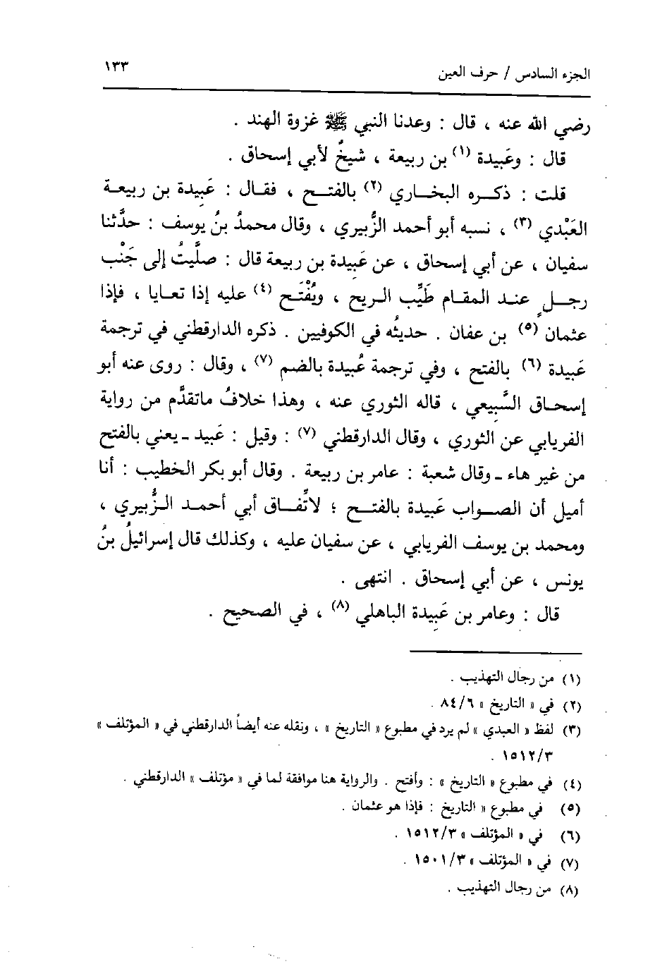 قلت: ذكره البُخَارِيّ بِالْفَتْح، فَقَالَ: عُبَيْدَة بن ربيعَة الْعَبْدي، نسبه أَبُو أَحْمد الزبيرِي، وَقَالَ مُحَمَّد بن يُوسُف: حَدثنَا سُفْيَان، عَن أبي إِسْحَاق، عَن عُبَيْدَة بن ربيعَة قَالَ: صليت إِلَى جنب رجل عِنْد الْمقَام طيب الرّيح، وَيفتح عَلَيْهِ إِذا تعايا، فَإِذا عُثْمَان بن عَفَّان. حَدِيثه فِي الْكُوفِيّين. ذكره الدَّارَقُطْنِيّ فِي تَرْجَمَة عُبَيْدَة بِالْفَتْح، وَفِي تَرْجَمَة عُبَيْدَة بِالضَّمِّ، وَقَالَ: روى عَنهُ أَبُو إِسْحَاق السبيعِي، قَالَه الثَّوْريّ عَنهُ، وَهَذَا خلاف مَا تقدم من رِوَايَة الْفرْيَابِيّ عَن الثَّوْريّ، وَقَالَ الدَّارَقُطْنِيّ: وَقيل: عبيد - يَعْنِي بِالْفَتْح من غير هَاء - وَقَالَ شُعْبَة: عَامر بن ربيعَة. وَقَالَ أَبُو بكر الْخَطِيب: أَنا أميل أَن الصَّوَاب عُبَيْدَة بِالْفَتْح؛ لِاتِّفَاق أبي أَحْمد الزبيرِي، وَمُحَمّد بن يُوسُف الْفرْيَابِيّ، عَن سُفْيَان عَلَيْهِ، وَكَذَلِكَ قَالَ إِسْرَائِيل بن يُونُس، عَن أبي إِسْحَاق. انْتهى.