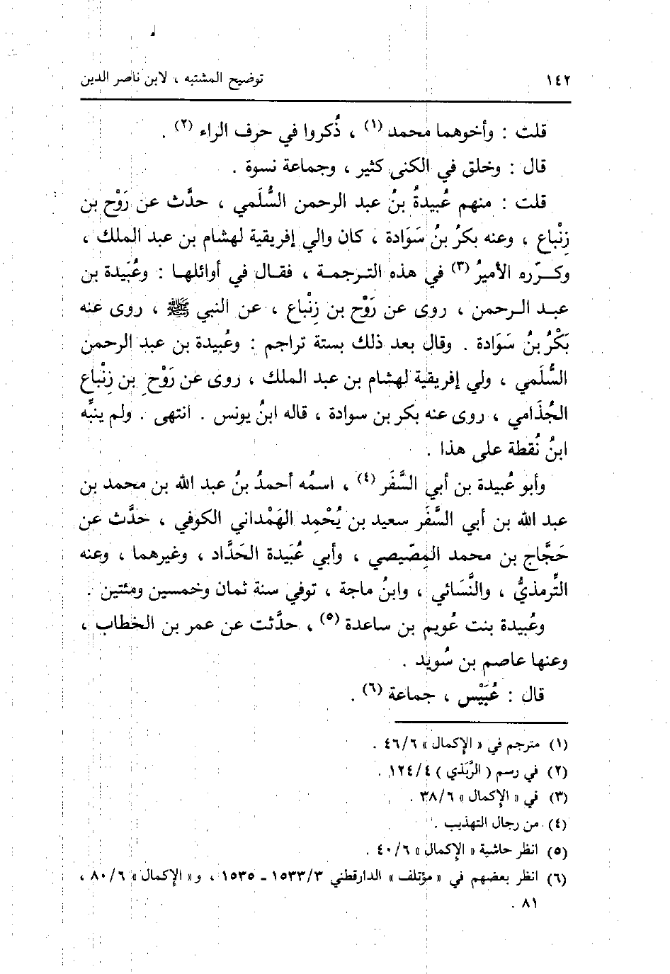 قلت: مِنْهُم عُبَيْدَة بن عبد الرَّحْمَن السّلمِيّ، حدث عَن روح بن زنباع، وَعنهُ بكر بن سوَادَة، كَانَ وَالِي إفريقية لهشام بن عبد الْملك، وكرره الْأَمِير فِي هَذِه التَّرْجَمَة، فَقَالَ فِي أوائلها: وَعبيدَة بن عبد الرَّحْمَن، روى عَن روح بن زنباع، عَن النَّبِي صلى الله عَلَيْهِ وَسلم، روى عَنهُ بكر بن سوَادَة. وَقَالَ بعد ذَلِك بِسِتَّة تراجم: وَعبيدَة بن عبد الرَّحْمَن السّلمِيّ، ولي افريقية لهشام بن عبد الْملك، روى عَن روح بن زنباع الجذامي، روى عَنهُ بكر بن سوَادَة، قَالَه ابْن يُونُس. انْتهى. وَلم يُنَبه ابْن نقطة على هَذَا.