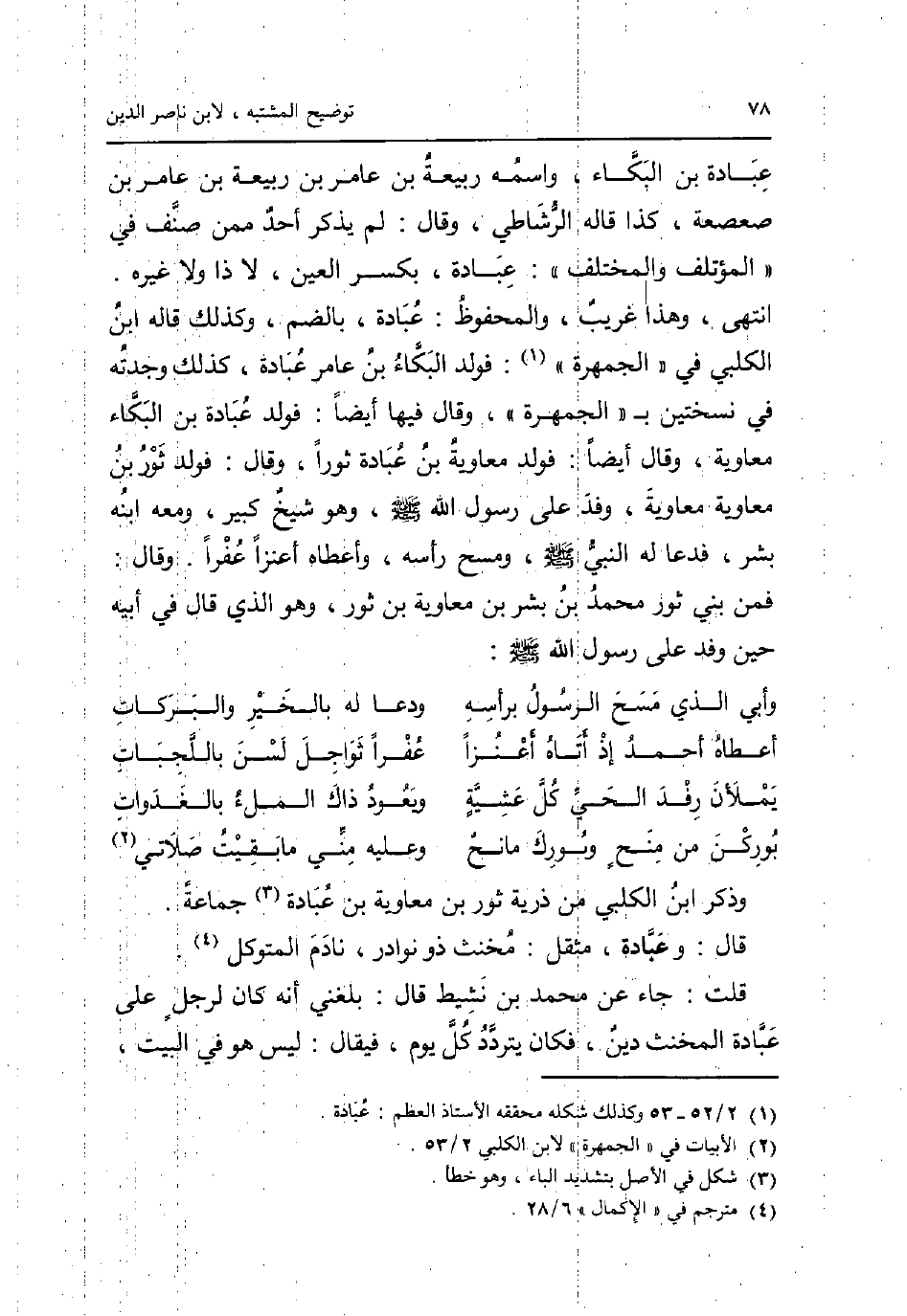 عبَادَة بن الْبكاء، واسْمه ربيعَة بن عَامر بن ربيعَة بن عَامر بن صعصعة، كَذَا قَالَه الرشاطي، وَقَالَ: لم يذكر أحد مِمَّن صنف فِي " المؤتلف والمختلف ": عبَادَة، بِكَسْر الْعين، لَا ذَا وَلَا غَيره. انْتهى، وَهَذَا غَرِيب، وَالْمَحْفُوظ: عبَادَة، بِالضَّمِّ، وَكَذَلِكَ قَالَه ابْن الْكَلْبِيّ فِي " الجمهرة ": فولد الْبكاء بن عَامر عبَادَة، كَذَلِك وجدته فِي نسختين ب " الجمهرة "، وَقَالَ فِيهَا أَيْضا: فولد عبَادَة بن الْبكاء مُعَاوِيَة، وَقَالَ أَيْضا: فولد مُعَاوِيَة بن عبَادَة ثورا، وَقَالَ: فولد ثَوْر بن مُعَاوِيَة مُعَاوِيَة، وَفد على رَسُول الله صلى الله عَلَيْهِ وَسلم، وَهُوَ شيخ كَبِير، وَمَعَهُ ابْنه بشر، فَدَعَا لَهُ النَّبِي صلى الله عَلَيْهِ وَسلم، وَمسح رَأسه، وَأَعْطَاهُ أَعْنُزًا عفرا. وَقَالَ: فَمن بني ثَوْر مُحَمَّد بن بشر بن مُعَاوِيَة بن ثَوْر، وَهُوَ الَّذِي قَالَه فِي أَبِيه حِين وَفد على رَسُول الله صلى الله عَلَيْهِ وَسلم: