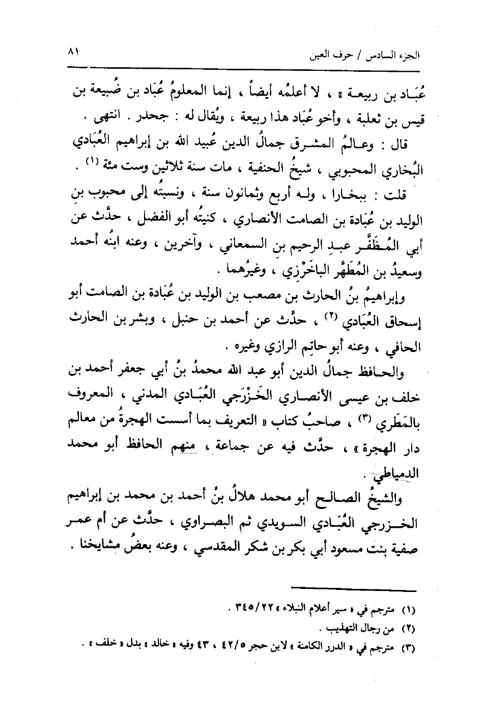 قَالَ: وعالم الْمشرق جمال الدّين عبيد الله بن إِبْرَاهِيم الْعَبَّادِيّ البُخَارِيّ المحبوبي، شيخ الْحَنَفِيَّة، مَاتَ سنة ثَلَاثِينَ وست مئة.