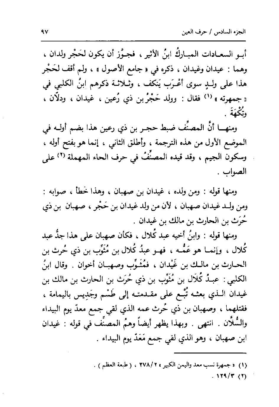 أَبُو السعادات الْمُبَارك ابْن الْأَثِير، فجوز أَن يكون لحجر ولدان، وهما: عيدَان وغيدان، ذكره فِي " جَامع الْأُصُول "، وَلم أَقف لحجر هَذَا على ولد سوى أعرب ينكف، وَثَلَاثَة ذكرهم ابْن الْكَلْبِيّ فِي " جمهرته " فَقَالَ: وَولد حجر بن ذِي رعين، غيدان، ودلان، وتكهة.