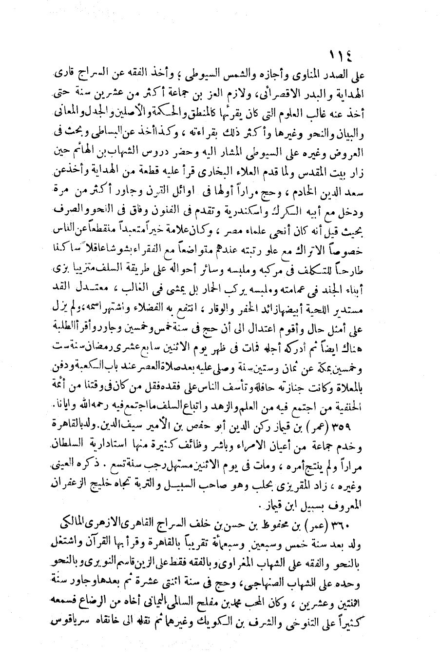 على الصَّدْر الْمَنَاوِيّ وَأَجَازَهُ وَالشَّمْس السُّيُوطِيّ وَأخذ الْفِقْه عَن السراج قاري الْهِدَايَة والبدر الأقصرائي، ولازم الْعِزّ بن جمَاعَة أَكثر من عشْرين سنة حَتَّى أَخذ عَنهُ غَالب الْعُلُوم الَّتِي كَانَ يقرئها كالمنطق وَالْحكمَة والأصلين والجدل والمعاني وَالْبَيَان والنحو وَغَيرهَا وَأكْثر ذَلِك بقرَاءَته، وَكَذَا أَخذ عَن الْبِسَاطِيّ وَبحث فِي الْعرُوض وَغَيره على السُّيُوطِيّ الْمشَار إِلَيْهِ وَحضر دروس الشهَاب بن الهائم حِين زار بَيت الْمُقَدّس وَلما قدم الْعَلَاء البُخَارِيّ قَرَأَ عَلَيْهِ قِطْعَة من الْهِدَايَة وَأخذ عَن سعد الدّين الْخَادِم، وَحج مرَارًا أَولهَا فِي أَوَائِل الْقرن وجاور أَكثر من مرّة وَدخل مَعَ أَبِيه الكرك وإسكندرية وَتقدم فِي الْفُنُون وفَاق فِي النَّحْو وَالصرْف بِحَيْثُ قيل أَنه كَانَ أنحى عُلَمَاء مصر، وَكَانَ عَلامَة خيرا متعبدا مُنْقَطِعًا عَن النَّاس خُصُوصا مَعَ علو رتبته عِنْدهم متواضعا مَعَ الْفُقَرَاء بشوشا عَاقِلا سَاكِنا طارحا للتكلف فِي مركبه وملبسه وَسَائِر أَحْوَاله على طَريقَة السّلف متزييا بزِي أَبنَاء الْجند فِي عمَامَته وملبسه يركب الْحمار بل يمشي فِي الْغَالِب، معتدل الْقد مستدير اللِّحْيَة أبيضها زَائِد الخفر وَالْوَقار، انْتفع بِهِ الْفُضَلَاء واشتهر اسْمه، وَلم يزل على أمثل حَال وأقوم اعْتِدَال إِلَى أَن حج فِي سنة خمس وَخمسين وجاور وأقرأ الطّلبَة هُنَاكَ أَيْضا ثمَّ أدْركهُ أَجله فَمَاتَ فِي ظهر يَوْم الِاثْنَيْنِ سَابِع عشري رَمَضَان سنة سِتّ وَخمسين بِمَكَّة عَن ثَمَان وَسِتِّينَ سنة وَصلى عَلَيْهِ بعد صَلَاة الْعَصْر عِنْد بَاب الْكَعْبَة وَدفن بالمعلاة وَكَانَت جنَازَته حافلة وتأسف النَّاس على فَقده فَقل من كَانَ فِي وقتنا من أَئِمَّة الْحَنَفِيَّة من اجْتمع فِيهِ من الْعلم والزهد وَاتِّبَاع السّلف مَا اجْتمع فِيهِ رَحمَه الله وإيانا.