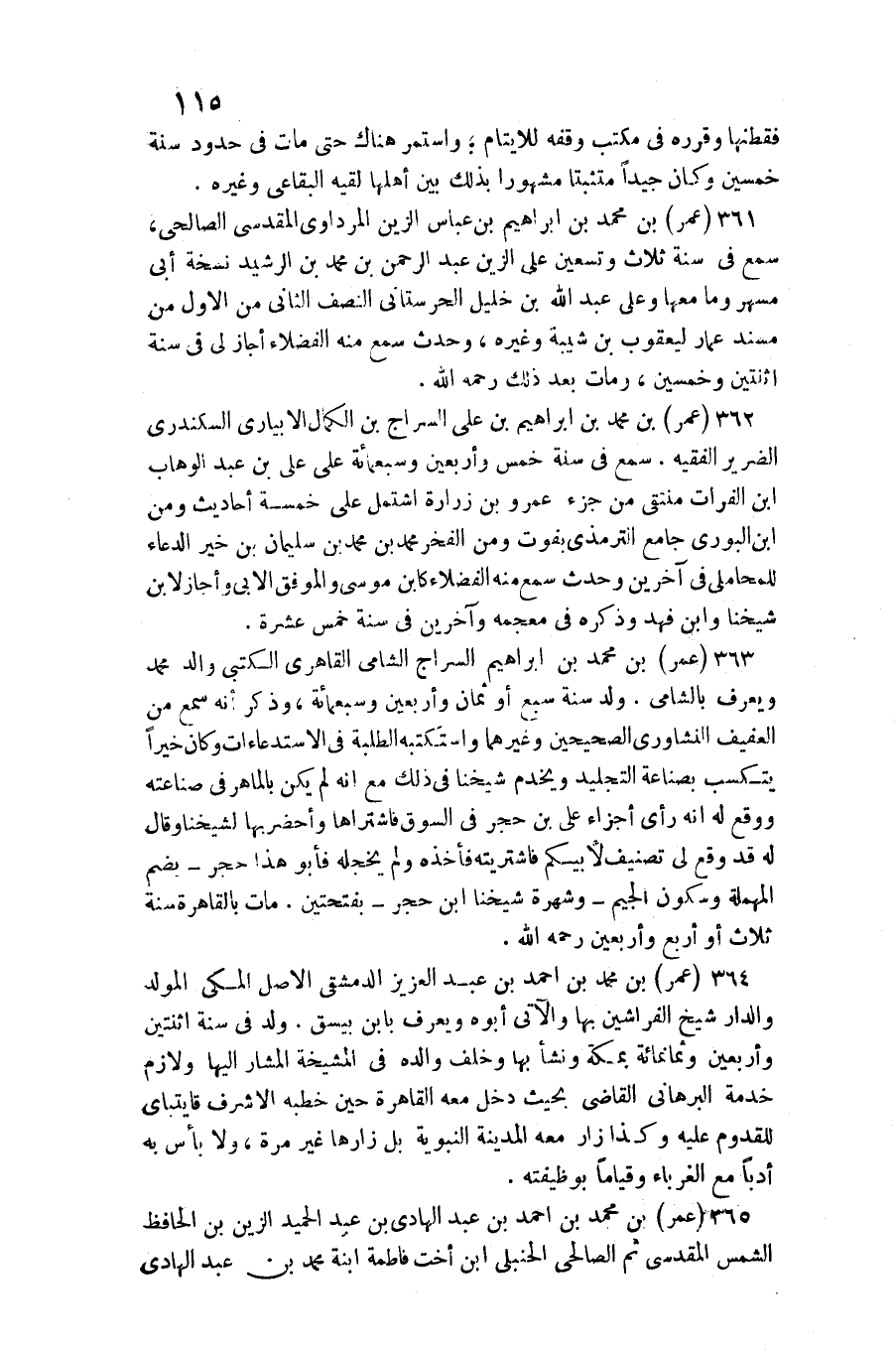 عمر بن مُحَمَّد بن إِبْرَاهِيم السراج الشَّامي القاهري الكتبي وَالِد مُحَمَّد وَيعرف بالشامي. ولد سنة سبع أَو ثَمَان وَأَرْبَعين وَسَبْعمائة، وَذكر أَنه سمع من الْعَفِيف النشاوري الصَّحِيحَيْنِ وَغَيرهمَا واستكتبه الطّلبَة فِي الاستدعاءات وَكَانَ خيرا يتكسب بصناعة التجليد ويخدم شَيخنَا فِي ذَلِك مَعَ أَنه لم يكن بالماهر فِي صناعته وَوَقع لَهُ أَنه رأى أَجزَاء عَليّ بن حجر فِي السُّوق فاشتراها وأحضر بهَا لشَيْخِنَا وَقَالَ لَهُ: قد وَقع لي تصنيف لأبيكم فاشتريته فَأَخذه وَلم يخجله فَأَبُو هَذَا حجر بِضَم الْمُهْملَة وَسُكُون الْجِيم وشهرة شَيخنَا ابْن حجر بِفتْحَتَيْنِ. مَاتَ بِالْقَاهِرَةِ سنة ثَلَاث أَو أَربع وَأَرْبَعين رَحمَه الله.)