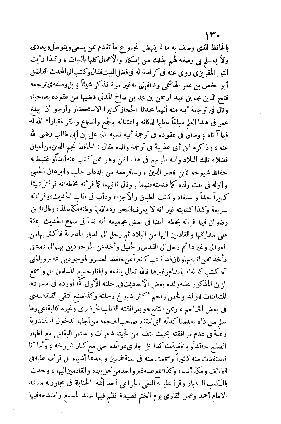 بِالْحَافِظِ الَّذِي وصف بِهِ مَا لم ينْهض لمجموع مَا تقدم مِمَّن يسْعَى ويتوسل ويعادي وَلَا يسلم فِي وَصفه لَهُم بذلك من إِنْكَار والأعمال كلهَا بِالنِّيَّاتِ، وَكَذَا رَأَيْت التقي المقريزي روى عَنهُ فِي كراسة لَهُ فِي فضل الْبَيْت فَقَالَ: وَكتب إِلَى الْمُحدث الْفَاضِل أَبُو حَفْص بن عمر الْهَاشِمِي وشافهني بِهِ غير مرّة فَذكر شَيْئا بل وَصفه فِي تَرْجَمَة فتح الدّين مُحَمَّد بن عبد الرَّحْمَن بن مُحَمَّد بن صَالح الْمدنِي قاضيها من عقوده بصاحبنا وَقَالَ فِي تَرْجَمَة أَبِيه مِنْهُ أَنَّهُمَا مُحدثا الْحجاز كثيرا الاستحضار وَأَرْجُو أَن يبلغ عمر فِي هَذَا الْعلم مبلغا عَظِيما لذكائه واعتنائه بِالْجمعِ وَالسَّمَاع وَالْقِرَاءَة بَارك الله لَهُ فِيمَا آتَاهُ وسَاق فِي عقوده فِي تَرْجَمَة أَبِيه نسبه إِلَى عَليّ بن أبي طَالب رَضِي الله عَنهُ، وَذكره ابْن أبي عذيبة فِي تَرْجَمَة وَالِده فَقَالَ: الْحَافِظ نجم الدّين من أَعْيَان فضلاء تِلْكَ الْبِلَاد وَإِلَيْهِ الْمرجع فِي هَذَا الْفَنّ وَهُوَ مِمَّن كتب عَنهُ أَيْضا واغتبط بِهِ حفاظ شُيُوخه كَابْن نَاصِر الدّين، وسافر مَعَه من بَلَده إِلَى حلب والبرهان الْحلَبِي وأنزله فِي بَيت وَلَده كَمَا قَدمته عَنْهُمَا وَقَالَ ثَانِيهمَا كَمَا قرأته بِخَطِّهِ أَنه قَرَأَ عَليّ شَيْئا كثيرا جدا واستفاد وَكتب الطباق والأجزاء ودأب فِي طلب الحَدِيث، وقراءته سريعة وَكَذَا كِتَابَته غير أَنه لَا يعرف النَّحْو رده الله إِلَى وَطنه مَكَّة سالما، وَقَالَ الزين رضوَان فِيمَا قرأته بِخَطِّهِ أَيْضا فِي بعض مجاميعه أَنه نَشأ فِي سَماع الحَدِيث بِمَكَّة على مشايخها والقادمين إِلَيْهَا من الْبِلَاد ثمَّ رَحل إِلَى الديار المصرية فَأكْثر بهَا من العوالي وَغَيرهَا ثمَّ رَحل إِلَى الْقُدس والخليل وَأخذ عَن الْمَوْجُودين بهما إِلَى دمشق فَأخذ عَمَّن لقِيه بهَا وَكَانَ قد كتب كثيرا عَن حَافظ الْعَصْر والموجودين بِمصْر وَبَلغنِي أَنه كتب كَذَلِك بِالشَّام وَغَيرهَا فَالله تَعَالَى يَنْفَعهُ وإيانا وَجَمِيع الْمُسلمين بل وأسمع الزين الْمَذْكُور عَلَيْهِ وَلَده بعض الْأَحَادِيث فِي رحلته الأولى كَمَا أوردهُ فِي مسودة المتباينات للْوَلَد ولخص تراجم أَكثر شُيُوخ رحلته وَكَذَا صنع التقي القلقشندي فِي بعض التراجم، وَمِمَّنْ انْتفع بِهِ وبمرافقته القطب الخيضري وَغَيره كالبقاعي وَمَا سلم من)