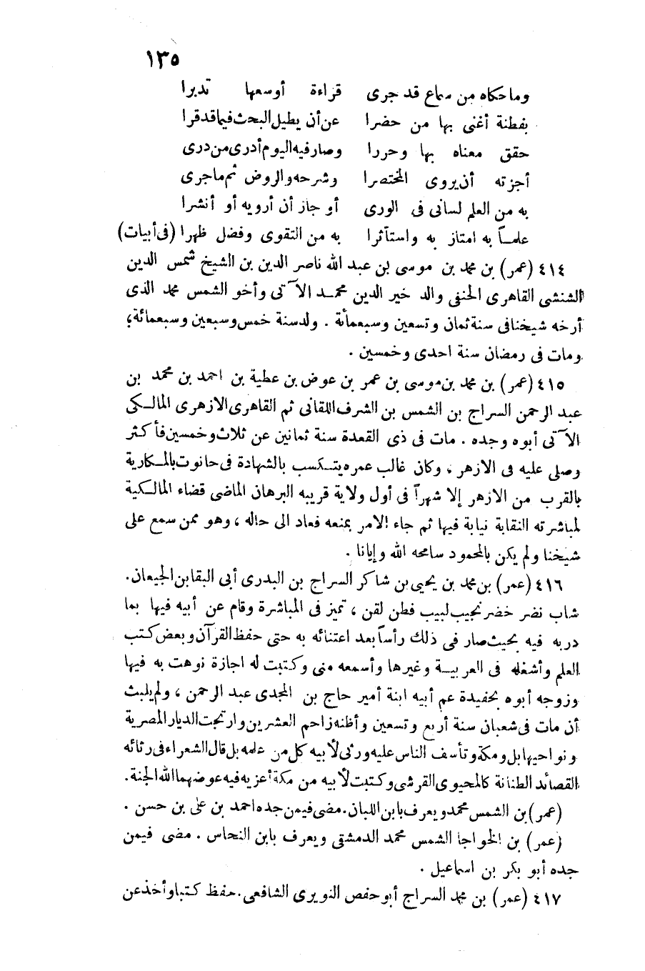 عمر بن مُحَمَّد بن مُوسَى بن عمر بن عوض بن عَطِيَّة بن أَحْمد بن مُحَمَّد بن عبد الرَّحْمَن السراج بن الشَّمْس بن الشّرف اللَّقَّانِيّ ثمَّ القاهري الْأَزْهَرِي الْمَالِكِي الْآتِي أَبوهُ وجده. مَاتَ فِي ذِي الْقعدَة سنة ثَمَانِينَ عَن ثَلَاث وَخمسين فَأكْثر وَصلي عَلَيْهِ فِي الْأَزْهَر، وَكَانَ غَالب عمره يتكسب بِالشَّهَادَةِ فِي حَانُوت بالمكارية بِالْقربِ من الْأَزْهَر إِلَّا شهرا فِي أول ولَايَة قَرِيبه الْبُرْهَان الْمَاضِي قَضَاء الْمَالِكِيَّة لمباشرته النقابة نِيَابَة فِيهَا ثمَّ جَاءَ الْأَمر بِمَنْعه فَعَاد إِلَى حَاله، وَهُوَ مِمَّن سمع على شَيخنَا وَلم يكن بالمحمود سامحه الله وإيانا.