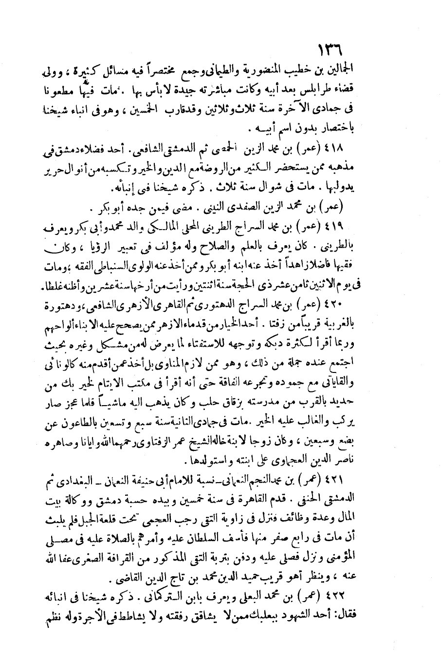 عمر بن مُحَمَّد الزين الْحِمصِي ثمَّ الدِّمَشْقِي الشَّافِعِي. أحد فضلاء دمشق فِي مذْهبه مِمَّن يستحضر الْكثير من الرَّوْضَة مَعَ الدّين وَالْخَيْر وتكسبه من أنوال حَرِير يدولبها. مَاتَ فِي شَوَّال سنة ثَلَاث. ذكره شَيخنَا فِي إنبائه.)