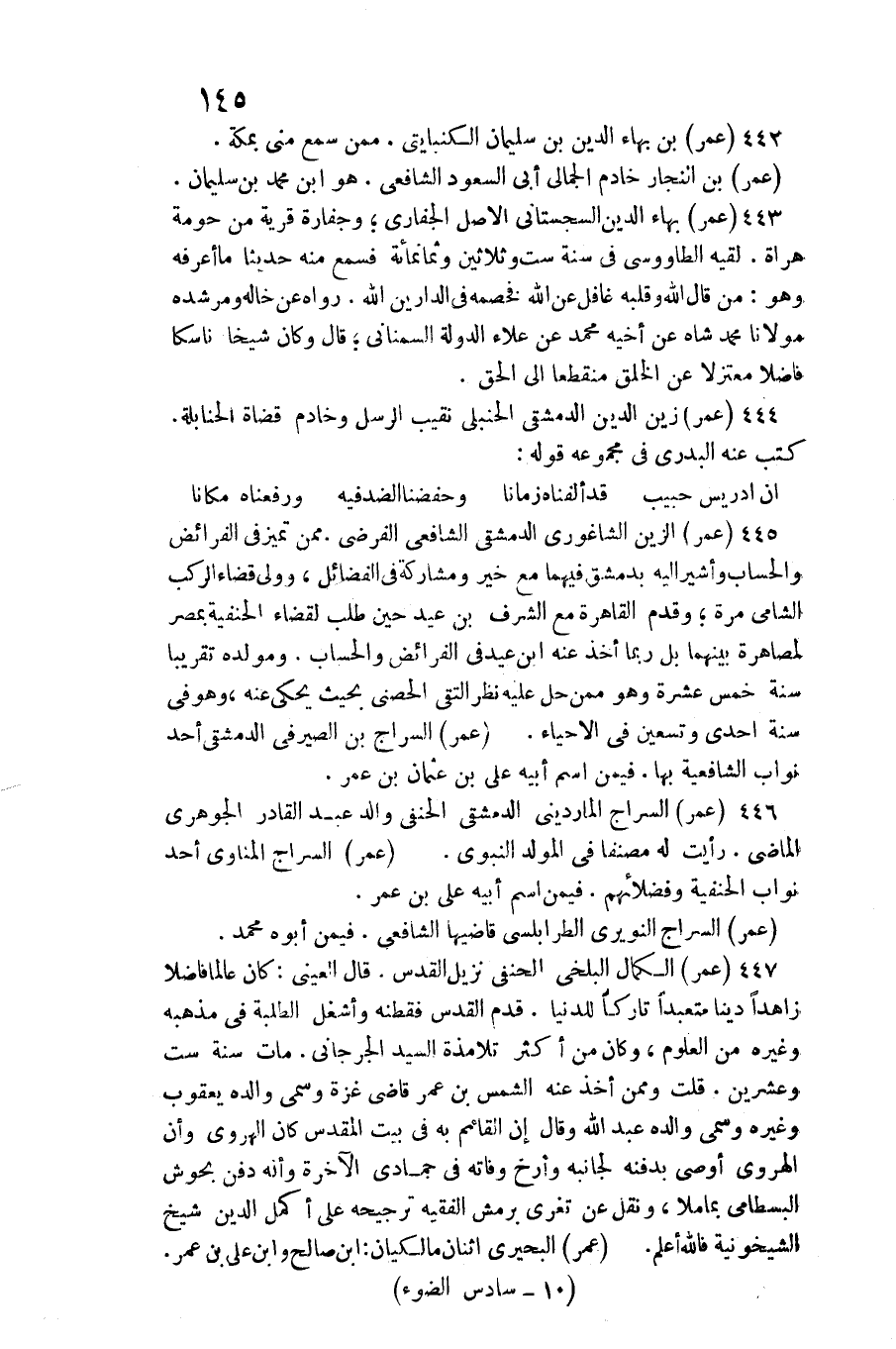 عمر الزين الشاغوري الدِّمَشْقِي الشَّافِعِي الفرضي. مِمَّن تميز فِي الْفَرَائِض والحساب وأشير إِلَيْهِ بِدِمَشْق فيهمَا مَعَ خير ومشاركة فِي الْفَضَائِل، وَولي قَضَاء الركب الشَّامي مرّة وَقدم الْقَاهِرَة مَعَ الشّرف بن عيد حِين طلب لقَضَاء الْحَنَفِيَّة بِمصْر لمصاهرة بَينهمَا بل رُبمَا أَخذ عَنهُ ابْن عيد فِي الْفَرَائِض والحساب. ومولده تَقْرِيبًا سنة خمس عشرَة وَهُوَ مِمَّن حل عَلَيْهِ نظر التقي الحصني بِحَيْثُ يحْكى عَنهُ، وَهُوَ فِي سنة إِحْدَى وَتِسْعين فِي الْأَحْيَاء. عمر بن السراج بن الصَّيْرَفِي الدِّمَشْقِي أحد نواب الشَّافِعِيَّة بهَا. فِيمَن اسْم أَبِيه عَليّ بن عُثْمَان بن عمر.)