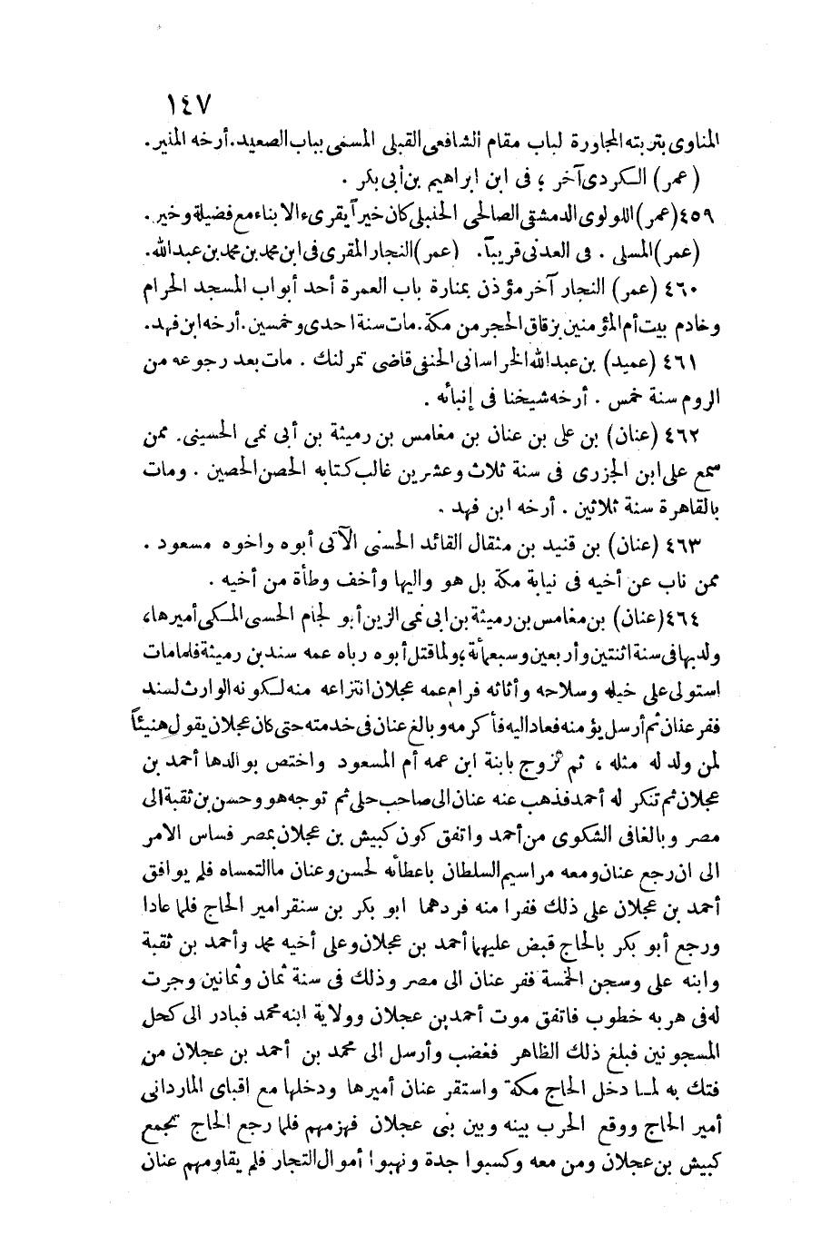 عنان بن مغامس بن رميثة بن أبي نمي الزين أَبُو لجام الحسني الْمَكِّيّ أميرها، ولد بهَا فِي سنة اثْنَتَيْنِ وَأَرْبَعين وَسَبْعمائة وَلما قتل أَبوهُ رباه عَمه سَنَد بن رميثة فَلَمَّا مَاتَ استولى على خيله وسلاحه وأثاثه فرام عَمه عجلَان انْتِزَاعه مِنْهُ لكَونه الْوَارِث لسند ففر عنان ثمَّ أرسل يُؤمنهُ فَعَاد إِلَيْهِ فَأكْرمه وَبَالغ عنان فِي خدمته حَتَّى كَانَ عجلَان يَقُول هَنِيئًا لمن ولد لَهُ مثله، ثمَّ تزوج بابنة ابْن عَمه أم مَسْعُود واختص بوالدها أَحْمد بن عجلَان ثمَّ تنكر لَهُ أَحْمد فَذهب عَنهُ عنان إِلَى صَاحب حلي ثمَّ توجه هُوَ وَحسن بن ثقبة إِلَى مصر وبالغافي الشكوى من أَحْمد وَاتفقَ كَون كبيش بن عجلَان بِمصْر فساس الْأَمر إِلَى أَن رَجَعَ عنان وَمَعَهُ مراسيم السُّلْطَان بإعطائه لحسن وعنان مَا التمساه فَلم يُوَافق أَحْمد بن عجلَان على ذَلِك ففرا مِنْهُ فردهما أَبُو بكر بن سنقر أَمِير الْحَاج فَلَمَّا عادا وَرجع أَبُو بكر بالحاج قبض عَلَيْهِمَا أَحْمد بن عجلَان وعَلى أَخِيه مُحَمَّد وَأحمد بن ثقبة وَابْنه عَليّ وسجن الْخَمْسَة ففر عنان إِلَى مصر وَذَلِكَ فِي سنة ثَمَان وَثَمَانِينَ وَجَرت لَهُ فِي هربه خطوب فاتفق موت أَحْمد بن عجلَان وَولَايَة ابْنه مُحَمَّد فبادر إِلَى كحل المسجونين فَبلغ ذَلِك الظَّاهِر فَغَضب وَأرْسل إِلَى مُحَمَّد بن أَحْمد بن عجلَان من فتك بِهِ لما دخل الْحَاج مَكَّة وَاسْتقر عنان أميرها ودخلها مَعَ أقباي المارداني أَمِير الْحَاج وَوَقع الْحَرْب بَينه وَبَين بني عجلَان فَهَزَمَهُمْ فَلَمَّا رَجَعَ الْحَاج تجمع كبيش بن عجلَان وَمن مَعَه وكسبوا جدة ونهبوا أَمْوَال التُّجَّار فَلم يقاومهم عنان