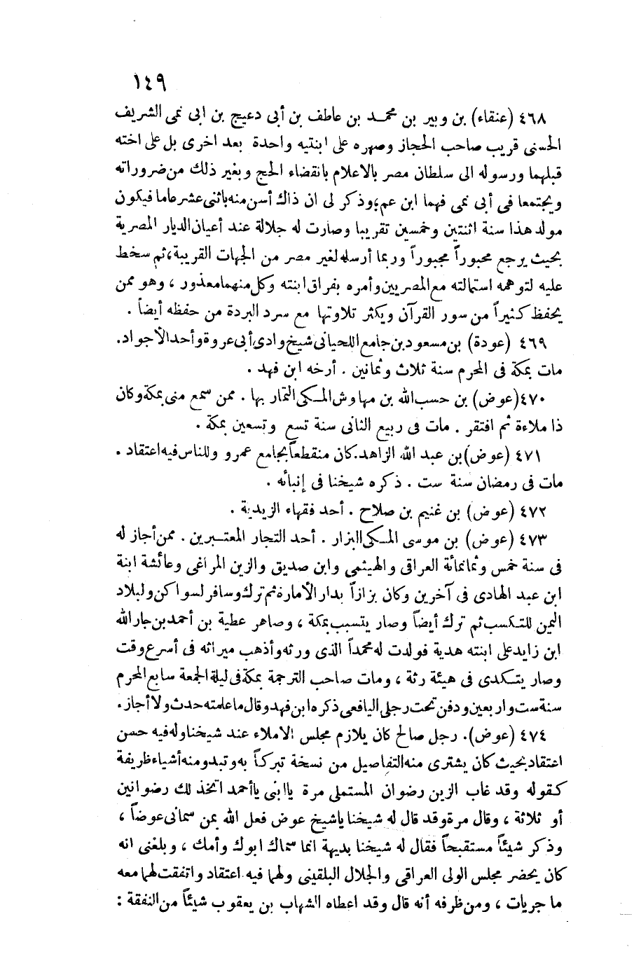 عوض رجل صَالح كَانَ يلازم مجْلِس الْإِمْلَاء عِنْد شَيخنَا وَله فِيهِ حسن اعْتِقَاد بِحَيْثُ كَانَ يَشْتَرِي مِنْهُ التفاصيل من نُسْخَة تبركا بِهِ وتبدو مِنْهُ أَشْيَاء ظريفة كَقَوْلِه وَقد غَابَ الزين رضوَان الْمُسْتَمْلِي مرّة يَا ابْني يَا أَحْمد اتخذ لَك رضوانين أَو ثَلَاثَة، وَقَالَ مرّة وَقد قَالَ لَهُ شَيخنَا يَا شيخ عوض: فعل الله بِمن سماني عوضا، وَذكر شَيْئا مستقبحا فَقَالَ لَهُ شَيخنَا بديهة: إِنَّمَا سماك أَبوك وأمك، وَبَلغنِي أَنه كَانَ يحضر مجْلِس الْوَلِيّ الْعِرَاقِيّ والجلال البُلْقِينِيّ وَلَهُمَا فِيهِ اعْتِقَاد واتفقت لَهما مَعَه مَا جريات، وَمن ظرفه أَنه قَالَ وَقد أعطَاهُ الشهَاب بن يَعْقُوب شَيْئا)