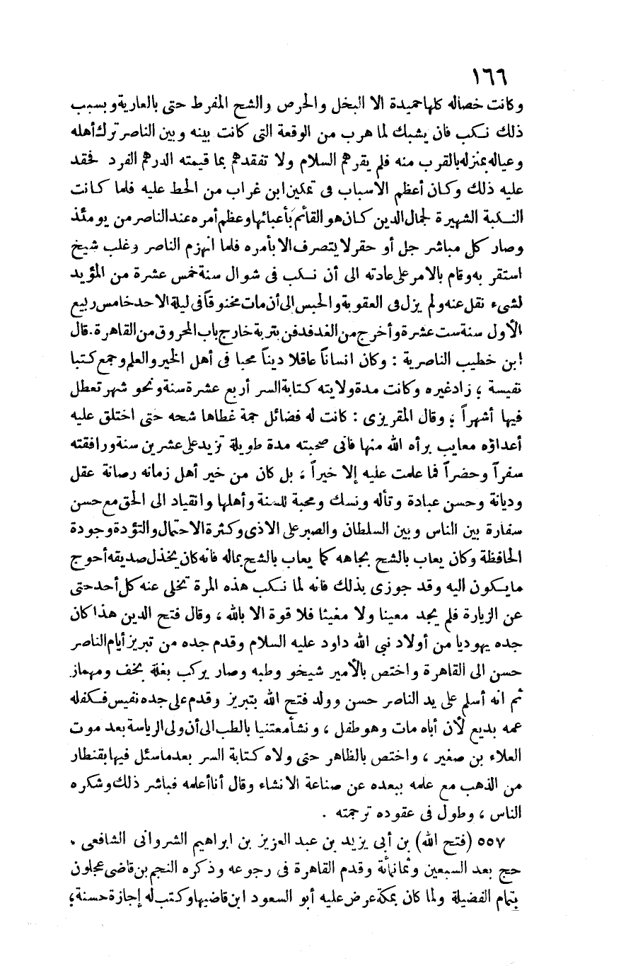 إِلَى الْحق مَعَ حسن سفارة بَين النَّاس وَبَين السُّلْطَان وَالصَّبْر على الْأَذَى وَكَثْرَة الِاحْتِمَال والتؤدة وجودة الحافظة وَكَانَ يعاب بالشح بجاهه كَمَا يعاب بالشح بِمَالِه فَإِنَّهُ كَانَ يخذل صديقه أحْوج مَا يكون إِلَيْهِ وَقد جوزي بذلك فَإِنَّهُ لما نكب هَذِه الْمرة تخلى عَنهُ كل أحد حَتَّى عَن الزِّيَارَة فَلم يجد معينا وَلَا مغيثا فَلَا قُوَّة إِلَّا بِاللَّه، وَقَالَ: فتح الدّين هَذَا كَانَ جده يَهُودِيّا من أَوْلَاد نَبِي الله دَاوُد عَلَيْهِ السَّلَام وَقدم جده من تبريز أَيَّام النَّاصِر حسن إِلَى الْقَاهِرَة واختص بالأمير شيخو وطبه وَصَارَ يركب بغلة بخف ومهماز ثمَّ إِنَّه أسلم على يَد النَّاصِر حسن وَولد فتح الله بتبريز وَقدم على جده نَفِيس فَكَفَلَهُ عَمه بديع لِأَن أَبَاهُ مَاتَ وَهُوَ طِفْل، وَنَشَأ معتنيا بالطب إِلَى أَن ولي الرياسة بعد موت الْعَلَاء بن صَغِير، واختص بِالظَّاهِرِ حَتَّى ولاه كِتَابَة السِّرّ بعد مَا سُئِلَ فِيهَا بقنطار من الذَّهَب مَعَ علمه ببعده عَن صناعَة الْإِنْشَاء وَقَالَ: أَنا أعلمهُ فباشر ذَلِك وشكره النَّاس، وَطول فِي عقوده تَرْجَمته.