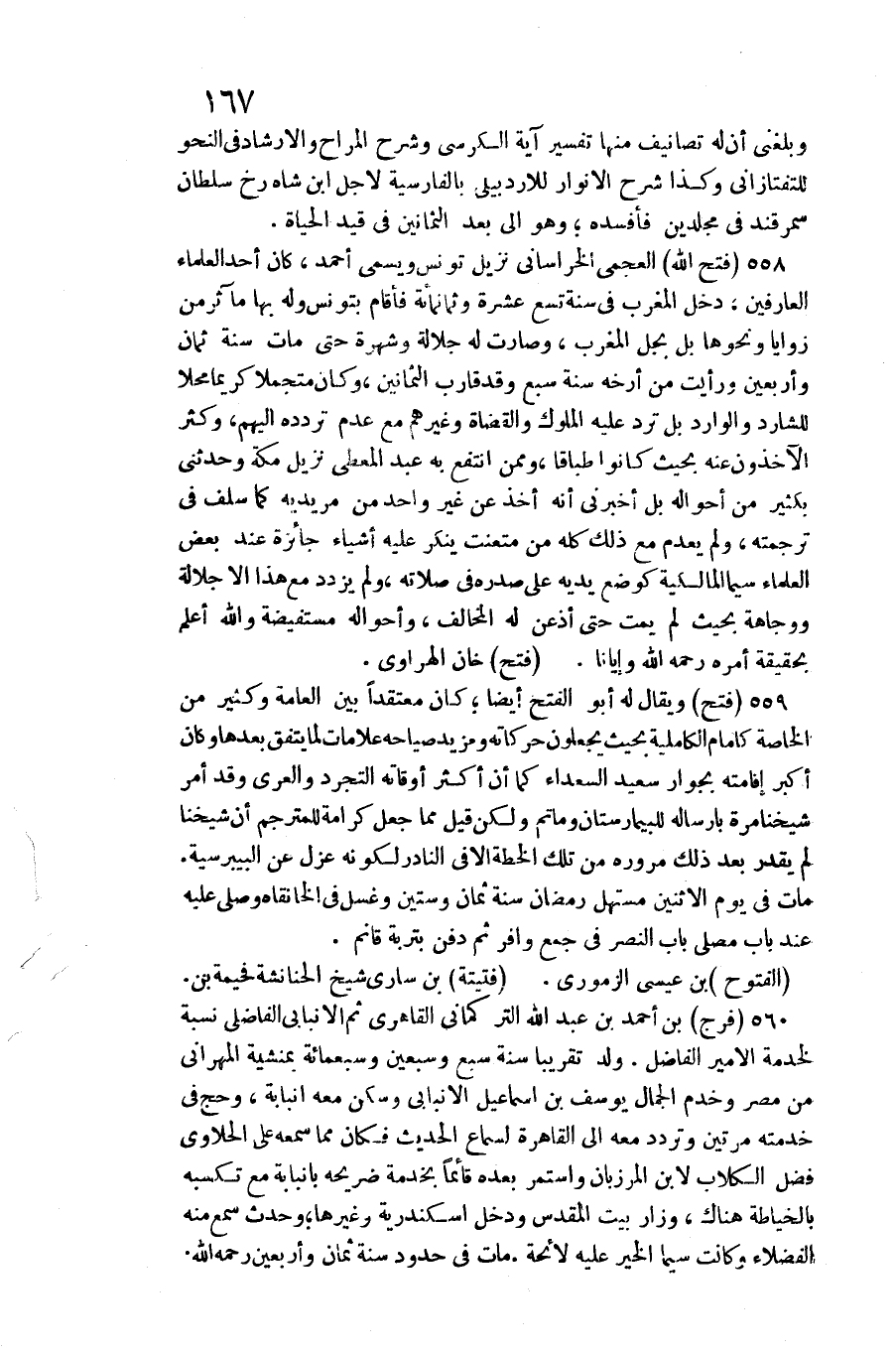 فتح الله العجمي الْخُرَاسَانِي نزيل تونس وَيُسمى أَحْمد، وَكَانَ أحد الْعلمَاء العارفين، دخل الْمغرب فِي سنة تسع عشرَة وَثَمَانمِائَة فَأَقَامَ بتونس وَله بهَا مآثر من زَوَايَا وَنَحْوهَا بل بجل الْمغرب، وَصَارَت لَهُ جلالة وشهرة حَتَّى مَاتَ سنة ثَمَان وَأَرْبَعين وَرَأَيْت من أرخه سنة سبع وَقد قَارب الثَّمَانِينَ، وَكَانَ متجملا كَرِيمًا محلا للشارد والوارد بل ترد عَلَيْهِ الْمُلُوك والقضاة وَغَيرهم مَعَ عدم تردده إِلَيْهِم، وَكثر الآخذون عَنهُ بِحَيْثُ كَانُوا طباقا، وَمِمَّنْ انْتفع بِهِ عبد الْمُعْطِي نزيل مَكَّة وحَدثني بِكَثِير من أَحْوَاله بل أَخْبرنِي أَنه أَخذ عَن غير وَاحِد من مريديه كَمَا سلف فِي تَرْجَمته، وَلم يعْدم مَعَ ذَلِك كُله من متعنت يُنكر عَلَيْهِ أَشْيَاء جائرة عِنْد بعض الْعلمَاء سِيمَا الْمَالِكِيَّة كوضع يَدَيْهِ على صَدره فِي صلَاته، وَلم يَزْدَدْ مَعَ هَذَا إِلَّا جلالة ووجاهة بِحَيْثُ لم يمت حَتَّى أذعن لَهُ الْمُخَالف، وأحواله مستفيضة وَالله أعلم بِحَقِيقَة أمره رَحمَه الله)