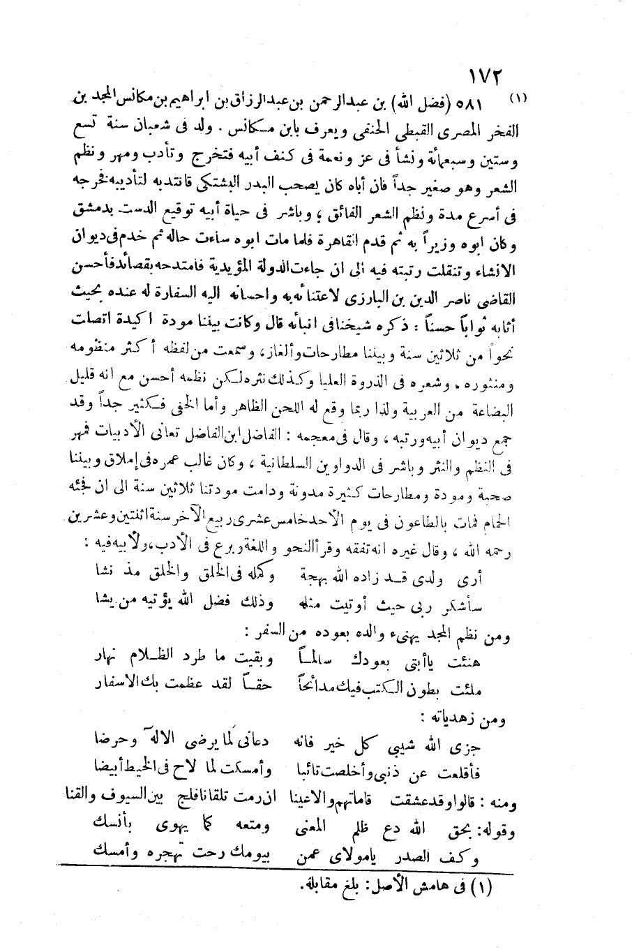 ونعمة فِي كنف أَبِيه فَتخرج وتأدب وَمهر ونظم الشّعْر وَهُوَ صَغِير جدا فَإِن أَبَاهُ كَانَ يصحب الْبَدْر البشتكي فانتدبه لتأديبه فخرجه فِي أسْرع مُدَّة ونظم الشّعْر الْفَائِق وباشر فِي حَيَاة أَبِيه توقيع الدست بِدِمَشْق وَكَانَ أَبوهُ وزيرا بِهِ ثمَّ قدم الْقَاهِرَة فَلَمَّا مَاتَ أَبوهُ ساءت حَاله ثمَّ خدم فِي ديوَان الْإِنْشَاء وتنقلت رتبته فِيهِ إِلَى أَن جَاءَت الدولة المؤيدية فامتدحه بقصائد فَأحْسن القَاضِي نَاصِر الدّين بن الْبَارِزِيّ لاعتنائه بِهِ وإحسانه إِلَيْهِ السفارة لَهُ عِنْده بِحَيْثُ أثابه ثَوابًا حسنا ذكره شَيخنَا فِي أنبائه قَالَ: وَكَانَت بَيْننَا مَوَدَّة أكيدة اتَّصَلت نَحوا من ثَلَاثِينَ سنة وبيننا مطارحات وألغاز، وَسمعت من لَفظه أَكثر منظومه ومنثوره، وشعره فِي الذرْوَة الْعليا وَكَذَلِكَ نثره لَكِن نظمه أحسن مَعَ أَنه قَلِيل البضاعة من الْعَرَبيَّة وَلذَا رُبمَا وَقع لَهُ اللّحن الظَّاهِر وَأما الْخَفي فكثير جدا وَقد جمع ديوَان أَبِيه ورتبه، وَقَالَ فِي مُعْجَمه: الْفَاضِل ابْن الْفَاضِل تعانى الأدبيات فمهر فِي النّظم والنثر وباشر فِي الدَّوَاوِين السُّلْطَانِيَّة، وَكَانَ غَالب عمره فِي إملاق وبيننا صُحْبَة ومودة ومطارحات كَثِيرَة مدونة ودامت مودتنا ثَلَاثِينَ سنة إِلَى أَن فجئه الْحمام فَمَاتَ بالطاعون فِي يَوْم الْأَحَد خَامِس عشري ربيع الآخر سنة اثْنَتَيْنِ وَعشْرين رَحمَه الله، وَقَالَ غَيره أَنه تفقه وَقَرَأَ النَّحْو واللغة وبرع فِي الْأَدَب، ولأبيه فِيهِ: