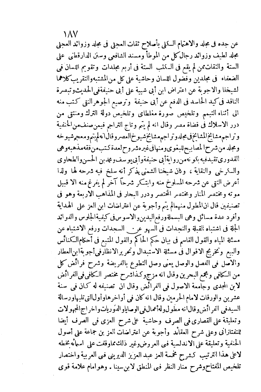 عَن جده فِي مُجَلد والاهتمام الْكُلِّي بأصلاح ثِقَات الْعجلِيّ فِي مُجَلد وزوائد رجال كل من الْمُوَطَّأ ومسند الشَّافِعِي وَسنَن الدَّارَقُطْنِيّ على السِّتَّة والثقات مِمَّن لم يَقع فِي الْكتب السِّتَّة فِي أَربع مجلدات وتقويم اللِّسَان فِي الضُّعَفَاء فِي مجلدين وفضول اللِّسَان وحاشية على كل من المشتبه والتقريب كِلَاهُمَا لشَيْخِنَا والأجوبة عَن اعْتِرَاض ابْن أبي شيبَة على أبي حنيفَة فِي الحَدِيث وتبصرة النَّاقِد فِي كيد الْحَاسِد فِي الدّفع عَن أبي حنيفَة وترصيع الْجَوْهَر النقي كتب مِنْهُ إِلَى أثْنَاء التَّيَمُّم وتلخيص صُورَة مغلطاي وتلخيص دولة التّرْك ومنتقى من دُرَر الأسلاك فِي قُضَاة مصر وَقَالَ أَنه لم يتم وتاج التراجم فِيمَن صنف من الْحَنَفِيَّة وتراجم مَشَايِخ الْمَشَايِخ فِي مُجَلد وتراجم مَشَايِخ شُيُوخ الْعَصْر وَقَالَ أَنه لم يتم ومعجم شُيُوخه ومجلد من شرح المصابيح لِلْبَغوِيِّ وَمِنْهَا فِي غَيره شُرُوح لعدة كتب من فقه مذْهبه وَهِي الْقَدُورِيّ تقيد فِيهِ بِكَوْنِهِ من رِوَايَة أبي حنيفَة وَأبي يُوسُف وَمُحَمّد بن الْحسن والطَّحَاوِي والكرخي والنقاية، وَكَانَ شَيخنَا الشمني يذاكر أَنه سلخ فِيهِ شَرحه لَهَا وَلذَا أعرض التقي عَن شَرحه المسلوخ مِنْهُ وابتكر شرحا آخر لم يفرغ مِنْهُ إِلَّا قبيل مَوته ومختصر الْمنَار ومختصر الْمُخْتَصر ودرر الْبحار فِي الْمذَاهب الْأَرْبَعَة وَهُوَ فِي تصنيفين قَالَ أَن المطول مِنْهُمَا لم يتم وأجوبة عَن اعتراضات ابْن الْعِزّ على الْهِدَايَة وأفرد عدَّة مسَائِل وَهِي الْبَسْمَلَة وَرفع الْيَدَيْنِ والأسوس فِي كَيْفيَّة الْجُلُوس والفوائد الجلة فِي اشْتِبَاه الْقبْلَة والنجدات فِي السَّهْو عَن السجدات وَرفع الِاشْتِبَاه عَن مَسْأَلَة الْمِيَاه وَالْقَوْل الْقَاسِم فِي بَيَان حكم الْحَاكِم وَالْقَوْل المتبع فِي أَحْكَام الْكَنَائِس وَالْبيع وَتَخْرِيج الْأَقْوَال فِي مَسْأَلَة الِاسْتِبْدَال وتحرير الأنظار فِي أجوبة ابْن الْعَطَّار وَالْأَصْل فِي الْفَصْل والوصل يَعْنِي وصل التَّطَوُّع بالفريضة وَشرح الْفَرَائِض كل من الْكَافِي وَمجمع الْبَحْرين وَقَالَ أَنه مزج وَكَذَا شرح مُخْتَصر الْكَافِي فِي الْفَرَائِض لِابْنِ المجدي وجامعة الْأُصُول فِي الْفَرَائِض وَقَالَ أَن تصنيفه لَهُ كَانَ فِي سنة عشْرين والورقات لإِمَام الْحَرَمَيْنِ وَقَالَ أَنه كَانَ فِي أواخرها وَأول الَّتِي تَلِيهَا ورسالة السَّيِّد فِي)