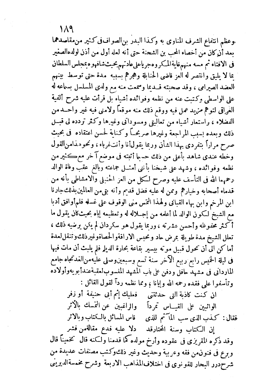 وَعظم انْتِفَاع الشّرف الْمَنَاوِيّ بِهِ وَكَذَا الْبَدْر بن الصَّواف فِي كثير من مقاصدهما بعد أَن كَانَ من أخصاء الْمُحب بن الشّحْنَة حَتَّى أَنه لَعَلَّه أول من أذن لوَلَده الصَّغِير فِي الْإِفْتَاء ثمَّ مَسّه مِنْهُم غَايَة الْمَكْرُوه جَريا على عَادَتهم بِحَيْثُ شافهوه بِمَجْلِس السُّلْطَان بِمَا لَا يَلِيق وانتصر لَهُ الْعِزّ قَاضِي الْحَنَابِلَة وهجرهم بِسَبَبِهِ مُدَّة حَتَّى توَسط بَينهم الْعَضُد الصيرامي، وَقد صحبته قَدِيما وَسمعت مِنْهُ مَعَ وَلَدي المسلسل بِسَمَاعِهِ لَهُ على الوَاسِطِيّ وكتبت عَنهُ من نظمه وفوائده أَشْيَاء بل قَرَأت عَلَيْهِ شرح ألفية الْعِرَاقِيّ لتوهم مزِيد عمل فِيهِ وَوَقع ذَلِك مِنْهُ موقعا ولامني فِيهِ غير وَاحِد من الْفُضَلَاء، واستعار أَشْيَاء من تعاليقي ومسوداتي وَغَيرهَا وَكثر تردده لي قبل ذَلِك وَبعده بِسَبَب الْمُرَاجَعَة وَغَيرهَا صَرِيحًا وكناية لحسن اعْتِقَاده فِي بِحَيْثُ صرح مرَارًا بتفردي بِهَذَا الشَّأْن وَرُبمَا يَقُول: أَنا وَأَنت غرباء، وَنَحْو هَذَا من القَوْل وخطه عِنْدِي شَاهد بِأَعْلَى من ذَلِك حَسْبَمَا أثْبته فِي مَوضِع آخر مَعَ كثير من نظمه وفوائده، وَشهد على شينا بأنني أمثل جماعته وَبَالغ عقب وَفَاة الْوَالِد رحمهمَا الله فِي التأسف عَلَيْهِ وَصرح لكل من الْعِزّ الْحَنْبَلِيّ والأمشاطي بِأَنَّهُ من قدماء أَصْحَابه وخيارهم وَمِمَّنْ لَهُ عَلَيْهِ فضل قديم وَأَنه بَقِي من الْعَالمين بذلك جارنا ابْن المرخم وَابْن بهاء القباني وَلِهَذَا التمس مني الْوُقُوف على غسله فَلم أوافق أدبا مَعَ الشَّيْخ لكَون الْوَالِد لما أعلمهُ من إجلاله لَهُ وتعظيمه إِيَّاه بِحَيْثُ كَانَ يَقُول: مَا أَكثر محفوظه وَأحسن عشرته، وَرُبمَا يَقُول: هُوَ سكردان لم يكن يرضيه ذَلِك، تعلل الشَّيْخ مُدَّة طَوِيلَة بِمَرَض حاد وبحبس الأراقة والحصاة وَغير ذَلِك وتنقل لعدة أَمَاكِن إِلَى أَن تحول قبيل مَوته بِيَسِير بقاعة بحارة الديلم فَلم يلبث أَن مَاتَ فِيهَا فِي لَيْلَة الْخَمِيس رَابِع ربيع الآخر سنة تسع وَسبعين وَصلى عَلَيْهِ من الْغَد تجاه جَامع المارداني فِي مشْهد حافل وَدفن على بَاب المشهد الْمَنْسُوب لعقبة عِنْد أَبَوَيْهِ وَأَوْلَاده وتأسفوا)