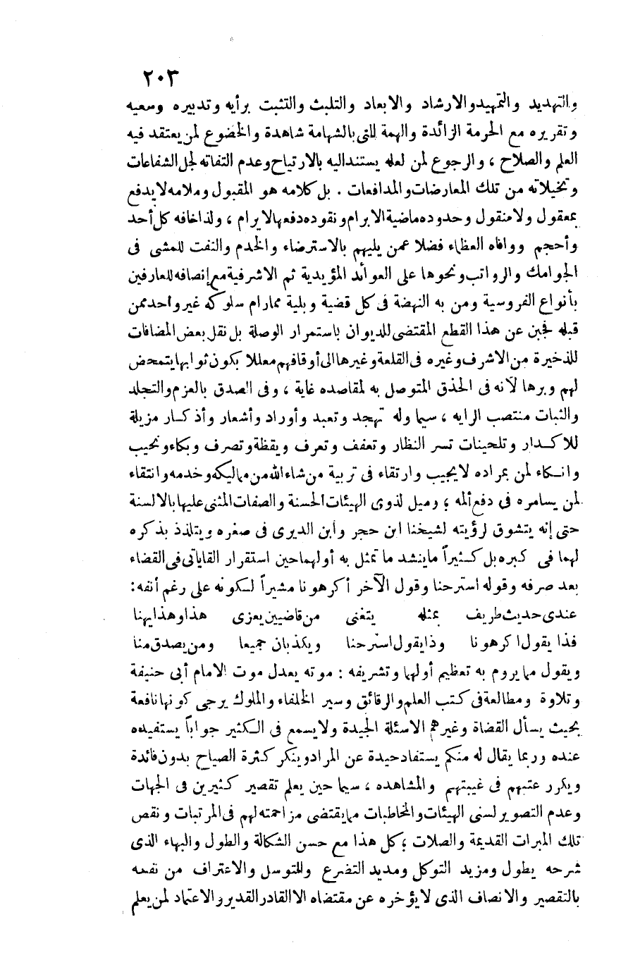 وَيَقُول مِمَّا يروم بِهِ تَعْظِيم أَولهمَا وتشريفه: مَوته يعدل موت الإِمَام أَبَا حنيفَة وتلاوة ومطالعة فِي كتب الْعلم وَالرَّقَائِق وسير الْخُلَفَاء والملوك يُرْجَى كَونهَا نافعة بِحَيْثُ يسْأَل الْقُضَاة وَغَيرهم الأسئلة الجيدة وَلَا يسمع فِي الْكثير جَوَابا يستفيده عِنْده وَرُبمَا يُقَال لَهُ مِنْكُم يُسْتَفَاد حيدة عَن المُرَاد وينكر كَثْرَة الصياح بِدُونِ فَائِدَة ويكرر عتبهم فِي غيبتهم والمشاهدة، سِيمَا حِين يعلم تَقْصِير كثيرين فِي الْجِهَات وَعدم التَّصْوِير لسنى الهيئات والمخاطبات مِمَّا يَقْتَضِي مزاحمته لَهُم فِي المرتبات وَنقص تِلْكَ المبرات الْقَدِيمَة والصلات كل هَذَا مَعَ حسن الشكالة والطول والبهاء الَّذِي شَرحه يطول ومزيد التَّوَكُّل ومديد التضرع وللتوسل وَالِاعْتِرَاف من نَفعه بالتقصير والإنصاف الَّذِي لَا يُؤَخِّرهُ عَن مُقْتَضَاهُ إِلَّا الْقَادِر الْقَدِير والاعتماد لمن يعلم