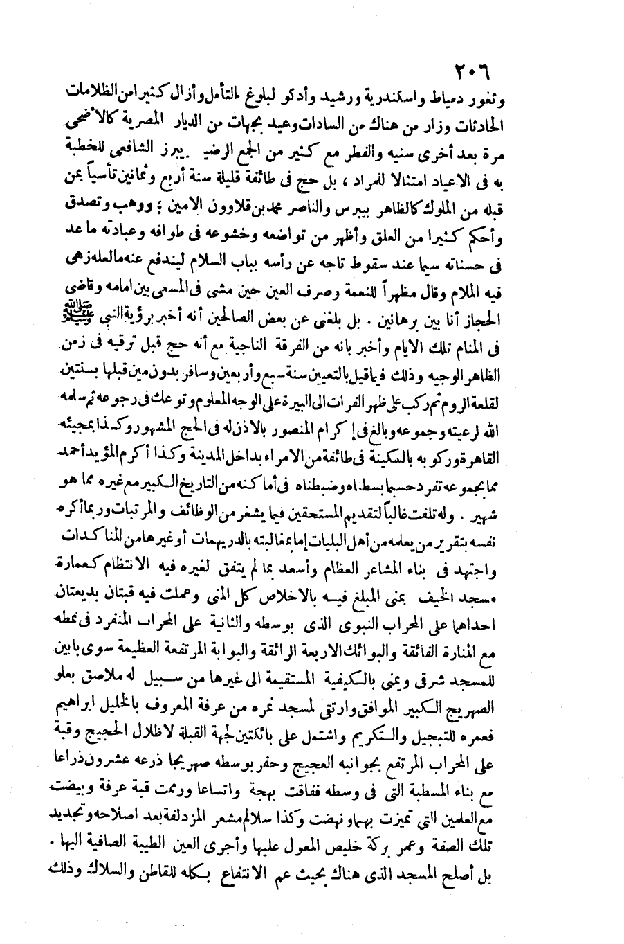 وثغور دمياط وإسكندرية ورشيد وأدكو لبلوغ التَّأَمُّل وأزال كثيرا من الظلامات الحادثات وزار من هُنَاكَ من السادات وَعِيد بجهات من الديار المصرية كالأضحى مرّة بعد أُخْرَى سنيه وَالْفطر مَعَ كثير من الْجمع الرضي يبرز الشَّافِعِي للخطبة بِهِ فِي الأعياد امتثالا للمراد، بل حج فِي طَائِفَة قَليلَة سنة أَربع وَثَمَانِينَ تأسيا بِمن قبله من الْمُلُوك كَالظَّاهِرِ بيبرس والناصر مُحَمَّد قلاوون الْأمين ووهب وَتصدق وَأحكم كثيرا من العلق وَأظْهر من تواضعه وخشوعه فِي طَوَافه وعبادته مَا عد فِي حَسَنَاته سِيمَا عِنْد سُقُوط تاجه عَن رَأسه بِبَاب السَّلَام ليندفع عَنهُ مَا لَعَلَّه زها فِيهِ الملام وَقَالَ مظْهرا للنعمة وَصرف الْعين حِين مَشى فِي الْمَسْعَى بَين إِمَامه وقاضي الْحجاز: أَنا بَين برهانين. بل بَلغنِي عِنْد بعض الصَّالِحين أَنه أخبر بِرُؤْيَة النَّبِي صلى الله عَلَيْهِ وَسلم فِي الْمَنَام تِلْكَ الْأَيَّام وَأخْبر أَنه من الْفرْقَة النَّاجِية مَعَ أَنه حج قبل ترقيه فِي زمن الظَّاهِر الْوَجِيه وَذَلِكَ فِيمَا قيل بِالتَّعْيِينِ سنة سبع وَأَرْبَعين وسافر بِدُونِ مين قبلهَا بِسنتَيْنِ لقلعة الرّوم ثمَّ ركب على ظهر الْفُرَات إِلَى البيرة على الْوَجْه الْمَعْلُوم وتوعك فِي رُجُوعه ثمَّ سلمه الله لرعيته وجموعه وَبَالغ فِي إكرام الْمَنْصُور بِالْإِذْنِ لَهُ فِي الْحَج الْمَشْهُور وَكَذَا بمجيئه الْقَاهِرَة وركوبه بِالسَّكِينَةِ فِي طَائِفَة من الْأُمَرَاء بداخل الْمَدِينَة وَكَذَا أكْرم الْمُؤَيد أَحْمد مِمَّا بجموعه تفرد حَسْبَمَا)