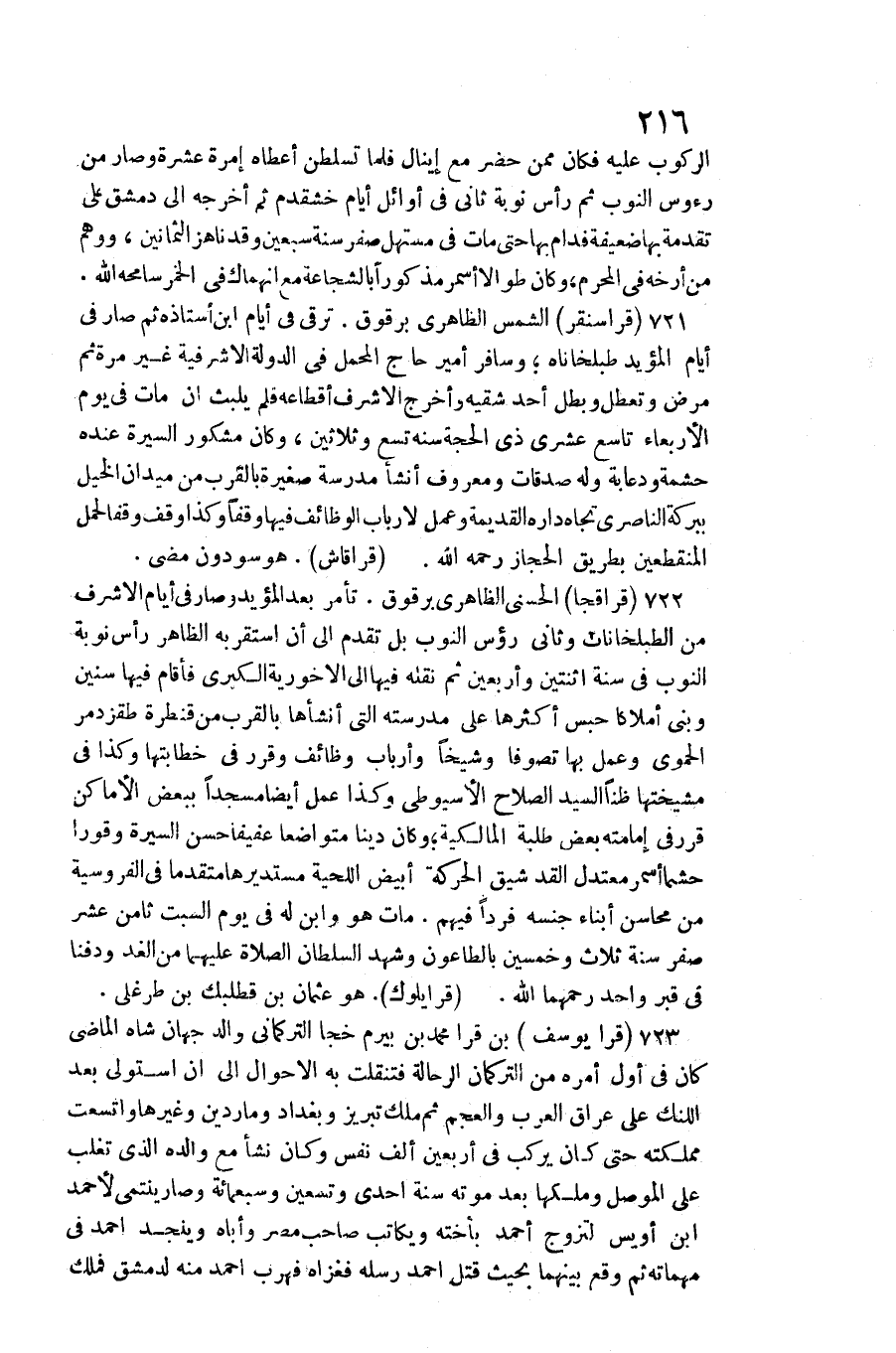 قراسنقر الشَّمْس الظَّاهِرِيّ برقوق. ترقى فِي أَيَّام ابْن أستاذه ثمَّ صَار فِي أَيَّام الْمُؤَيد طبلخاناه وسافر أَمِير حَاج الْمحمل فِي الدولة الأشرفية غير مرّة ثمَّ تعطل وَبَطل أحد شقيه وَأخرج الْأَشْرَف أقطاعه فَلم يلبث أَن مَاتَ فِي يَوْم الْأَرْبَعَاء تَاسِع عشري ذِي الْحجَّة سنة تسع وَثَلَاثِينَ، وَكَانَ مشكور السِّيرَة عِنْده حشمة ودعابة وَله صدقَات ومعروف أنشأ مدرسة صَغِيرَة بِالْقربِ من ميدان الْخَلِيل ببركة الناصري تجاه دَاره الْقَدِيمَة وَعمل لأرباب الْوَظَائِف فِيهَا وَقفا وَكَذَا وقف وَقفا لحمل المنقطعين بطرِيق الْحجاز رَحمَه الله. قراقاش. هُوَ سودون مضى.