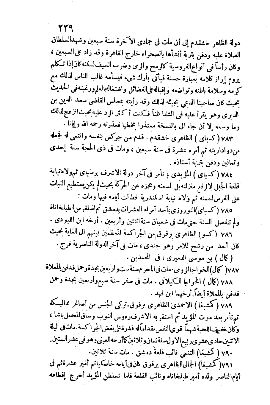 دولة الظَّاهِر خشقدم إِلَى أَن مَاتَ فِي جُمَادَى الْآخِرَة سنة سبعين وَشهد السُّلْطَان الصَّلَاة عَلَيْهِ وَدفن بتربة أَنْشَأَهَا بالصحراء خَارج الْقَاهِرَة وَقد زَاد على السّبْعين،)