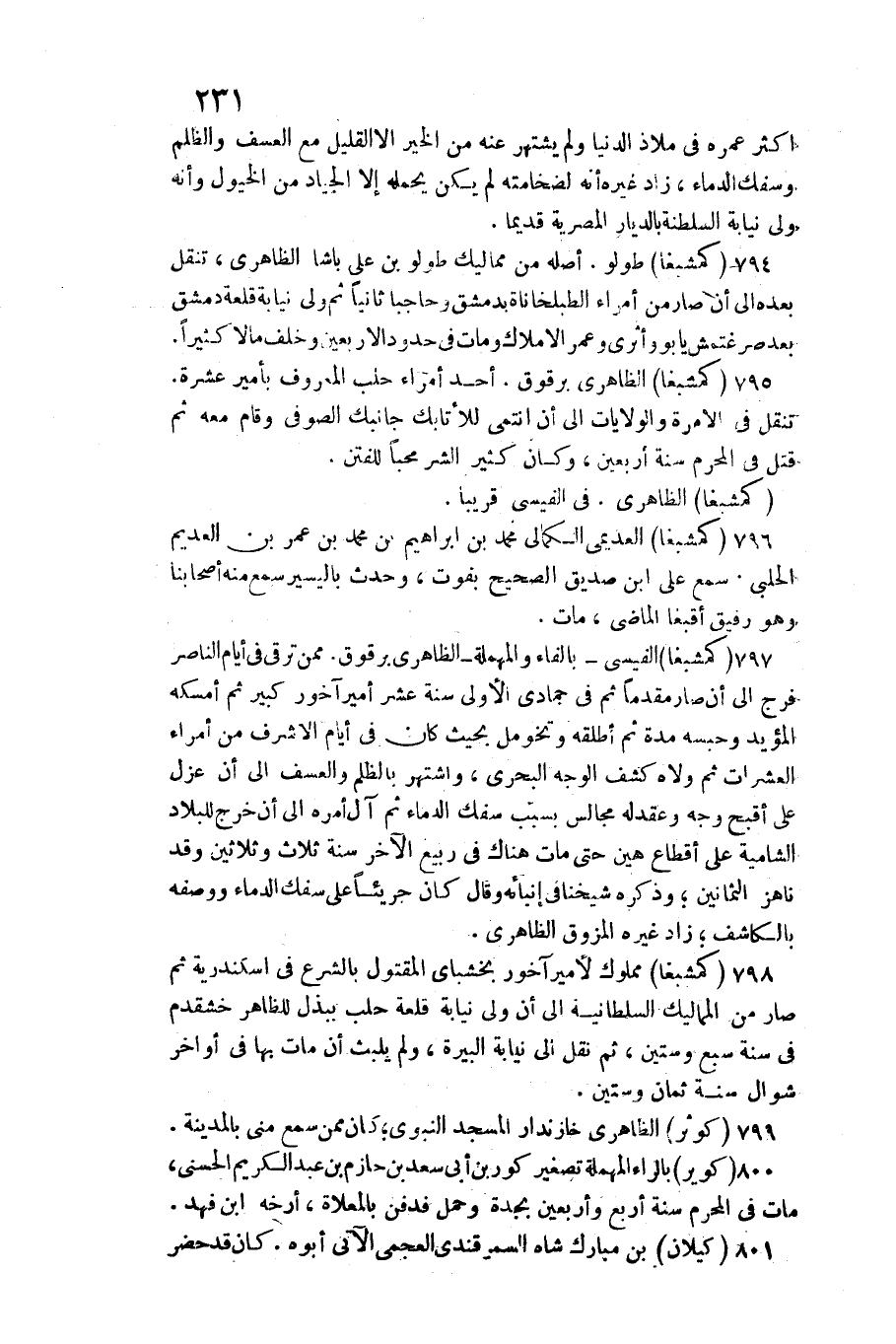 كمشبغا الفيسي بِالْفَاءِ والمهملة الظَّاهِرِيّ برقوق. مِمَّن ترقى فِي أَيَّام النَّاصِر فرج إِلَى أَن صَار مقدما ثمَّ فِي جُمَادَى الأولى سنة عشر أَمِير آخور كَبِير ثمَّ أمْسكهُ الْمُؤَيد وحبسه مُدَّة ثمَّ أطلقهُ وتخومل بِحَيْثُ كَانَ فِي أَيَّام الْأَشْرَف من أُمَرَاء العشرات ثمَّ ولاه كشف الْوَجْه البحري، واشتهر بالظلم والعسف إِلَى أَن عزل على أقبح وَجه وَعقد لَهُ مجَالِس بِسَبَب سفك الدِّمَاء ثمَّ آل أمره إِلَى أَن خرج للبلاد الشامية على أقطاع هَين حَتَّى مَاتَ هُنَاكَ فِي ربيع الآخر سنة ثَلَاث وَثَلَاثِينَ وَقد ناهز الثَّمَانِينَ وَذكره شَيخنَا فِي إنبائه وَقَالَ: كَانَ جريئا على سفك الدِّمَاء وَوَصفه بالكاشف زَاد غَيره المزوق الظَّاهِرِيّ.