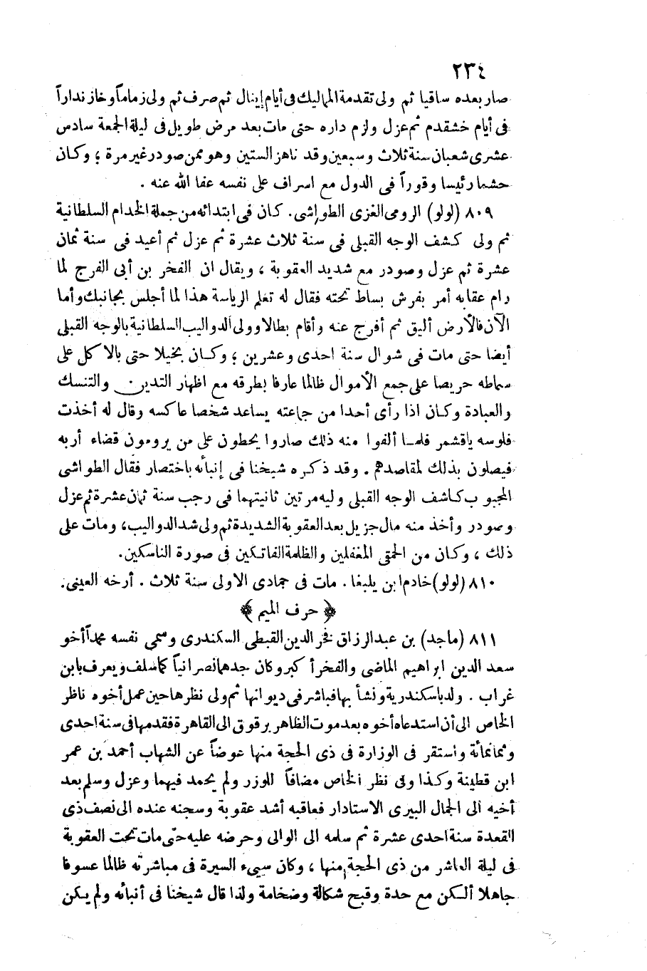 لولو الرُّومِي الْغَزِّي الطواشي. كَانَ فِي ابْتِدَائه من جملَة الخدام السُّلْطَانِيَّة ثمَّ ولي كشف الْوَجْه القبلي فِي سنة ثَلَاث عشرَة ثمَّ عزل ثمَّ أُعِيد فِي سنة ثَمَان عشرَة ثمَّ عزل وصودر مَعَ شَدِيد الْعقُوبَة، وَيُقَال أَن الْفَخر بن أبي الْفرج لما رام عِقَابه أَمر بفرش بِسَاط تَحْتَهُ فَقَالَ لَهُ: تعلم الرياسة هَذَا لما أَجْلِس بجانبك وَأما الْآن فالأرض أليق ثمَّ أفرج عَنهُ وَأقَام بطالا وَولي الدواليب السُّلْطَانِيَّة بِالْوَجْهِ القبلي أَيْضا حَتَّى مَاتَ فِي شَوَّال سنة إِحْدَى وَعشْرين وَكَانَ بَخِيلًا حَتَّى بِالْأَكْلِ على سماطه حَرِيصًا على جمع الْأَمْوَال ظَالِما عَارِفًا بِطرقِهِ مَعَ إِظْهَار التدين والتنسك وَالْعِبَادَة وَكَانَ ذَا رَأْي أحدا من جماعته يساعد شخصا عاكسه وَقَالَ لَهُ: أخذت فلوسه يَا قشمر فَلَمَّا ألفوا مِنْهُ ذَلِك صَارُوا يحطون على من يرومون قَضَاء أربه فيصلون بذلك لمقاصدهم. وَقد ذكره شَيخنَا فِي إنبائه بِاخْتِصَار فَقَالَ الطواشي الْمَجْبُوب كاشف الْوَجْه القبلي وليه مرَّتَيْنِ ثانيتهما فِي رَجَب سنة ثَمَان عشرَة ثمَّ عزل وصودر وَأخذ مِنْهُ مَال جزيل بعد الْعقُوبَة الشَّدِيدَة ثمَّ ولي شدّ الدواليب، وَمَات على ذَلِك، وَكَانَ من الحمقى المغفلين والظلمة الفاتكين فِي صُورَة الناسكين.