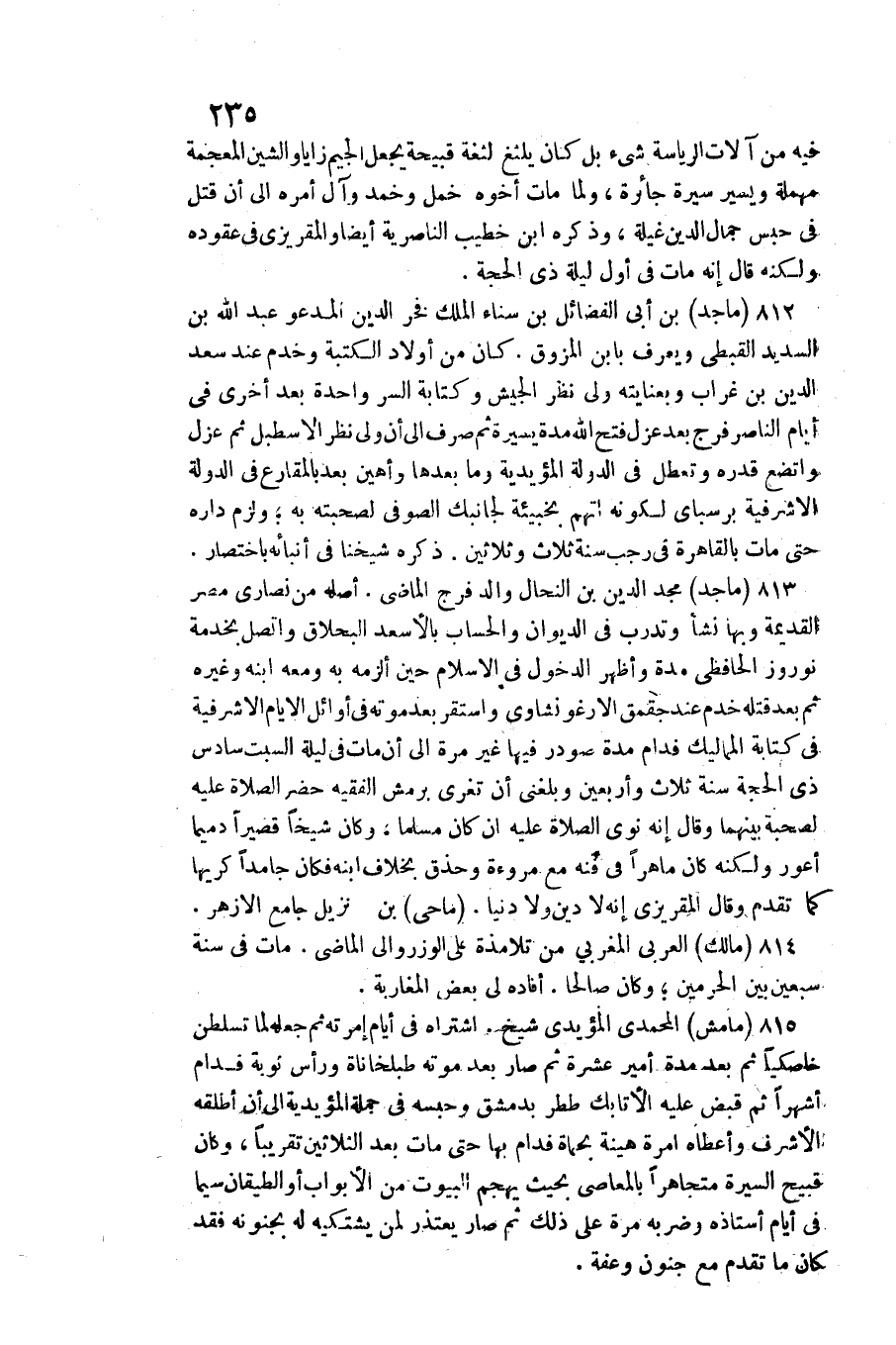فِيهِ من آلَات الرياسة شَيْء بل كَانَ يلثغ لثغة قبيحة يَجْعَل الْجِيم زايا والشين الْمُعْجَمَة مُهْملَة ويسير سيرة جائرة، وَلما مَاتَ أَخُوهُ خمل وخمد وَآل أمره إِلَى أَن قتل فِي حبس جمال الدّين غيلَة، وَذكره ابْن خطيب الناصرية أَيْضا والمقريزي فِي عقوده وَلكنه قَالَ إِنَّه مَاتَ فِي أول لَيْلَة ذِي الْحجَّة.